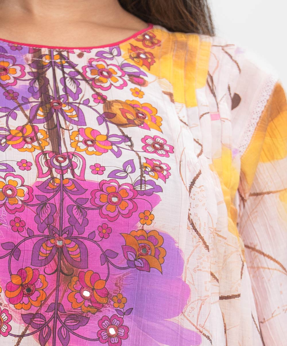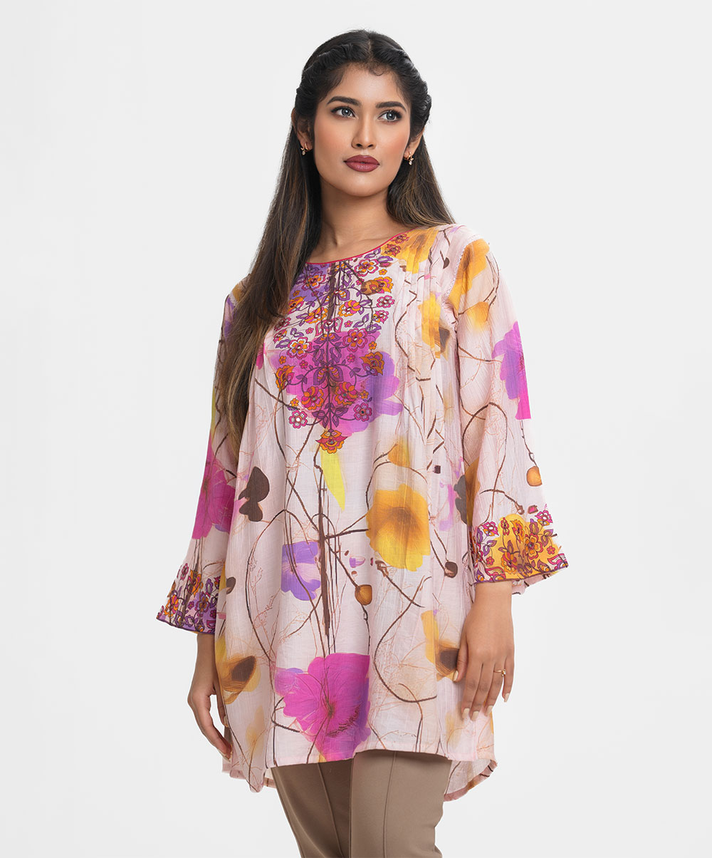 Round neck A-line tunic in cotton-blend fabric. Three-quarter sleeves. Karchupi and Pintuck at the front.