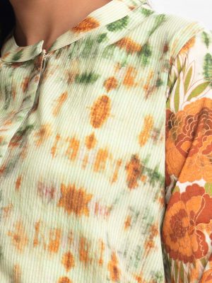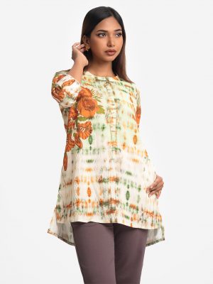 Band collar, patterned midi tunic in cotton-blend fabric. Three-quarter sleeves with scallop cut.