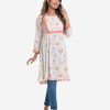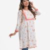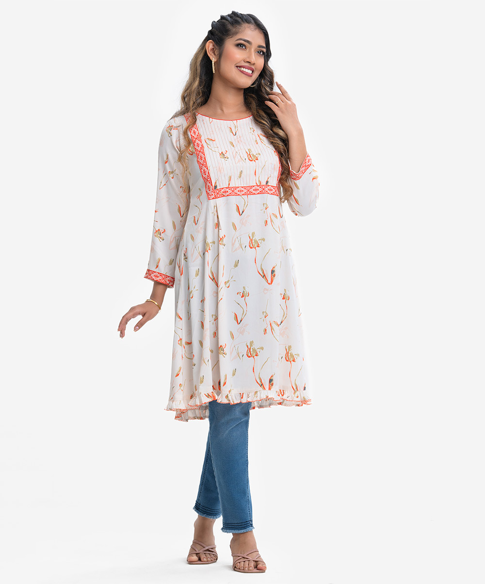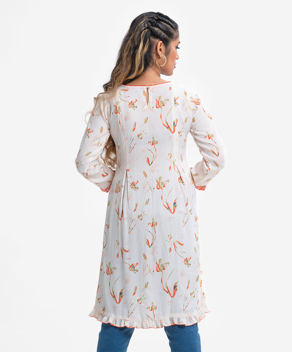 Women’s A-line tunic in printed joom fabric. Round neck, full sleeves. Patch and pin tuck at front. Frill hemline.