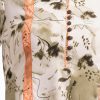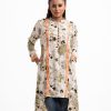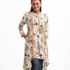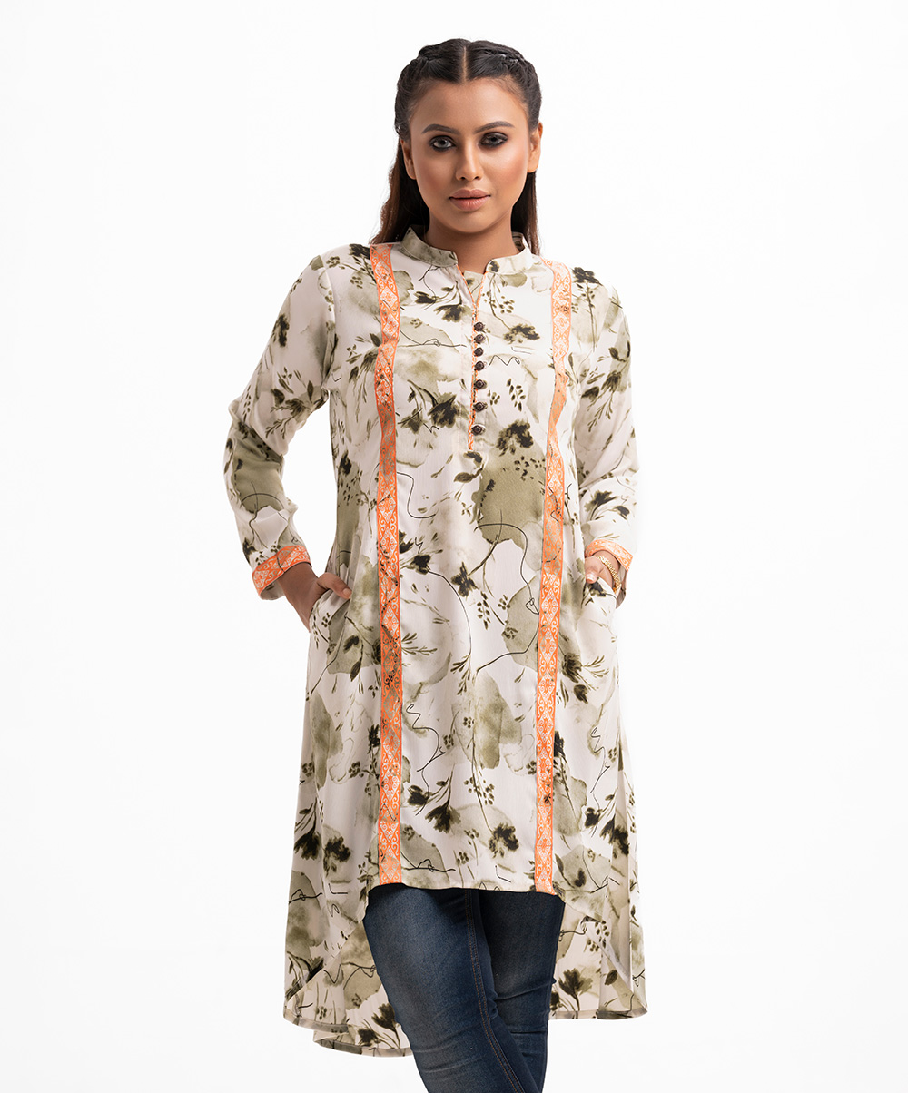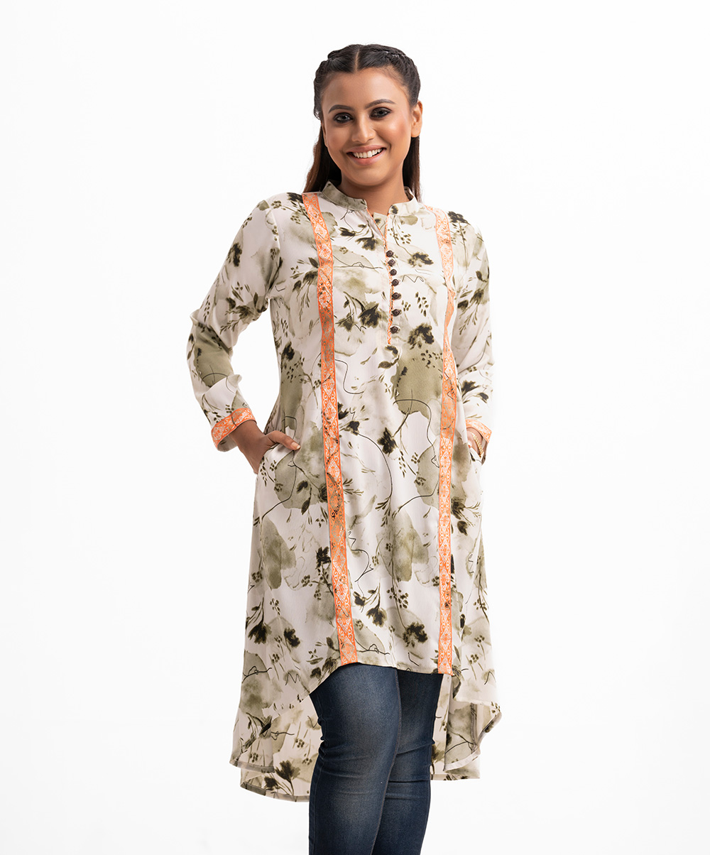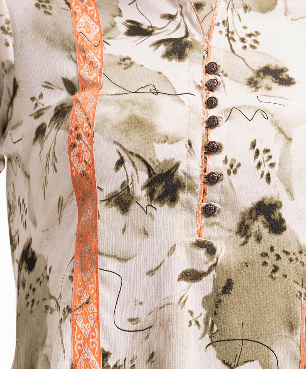 A-line tunic with contrast patch on joom fabric. Three-quarter sleeves and high-low hem. Mandarin collar with button details.
