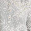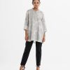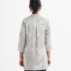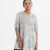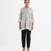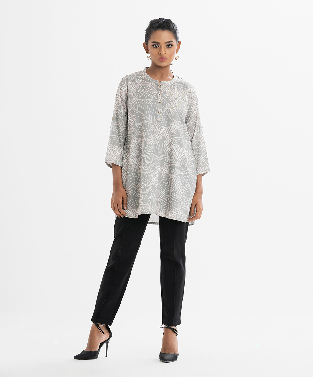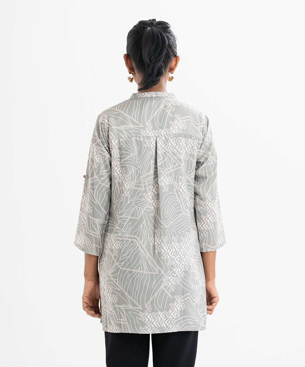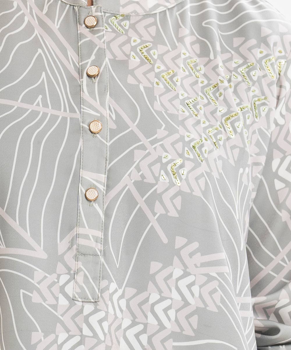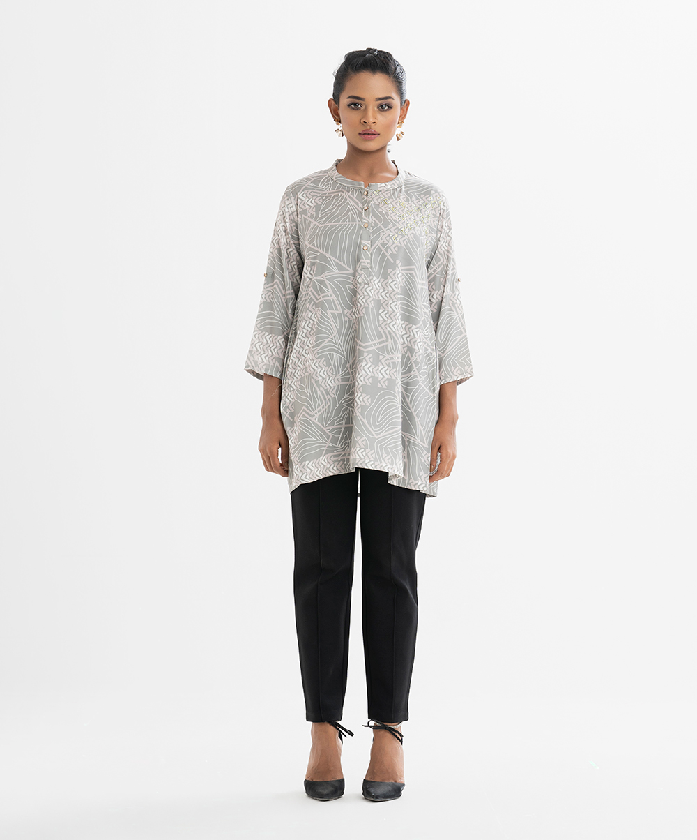 Women’s printed tent-style tunic in satin fabric. Stand collar, three-quarter sleeved. Button fastening and karchupi at the front.