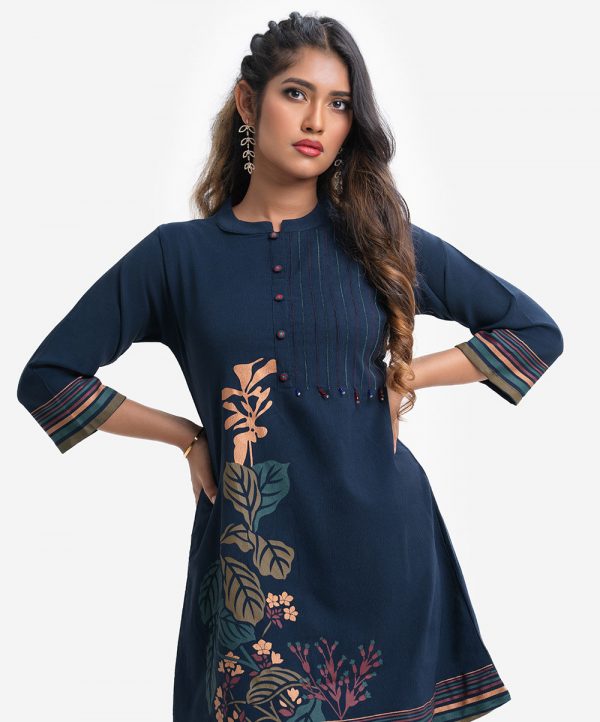 Band collar A-line tunic in stretchable georgette fabric. Three-quarter sleeves, jewelled tassels at the front.