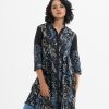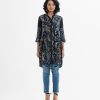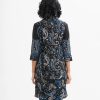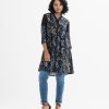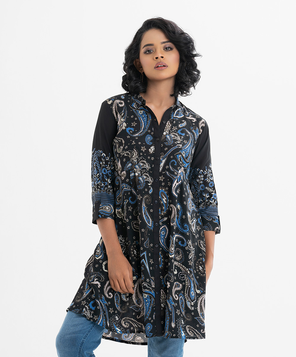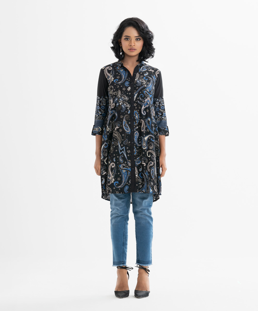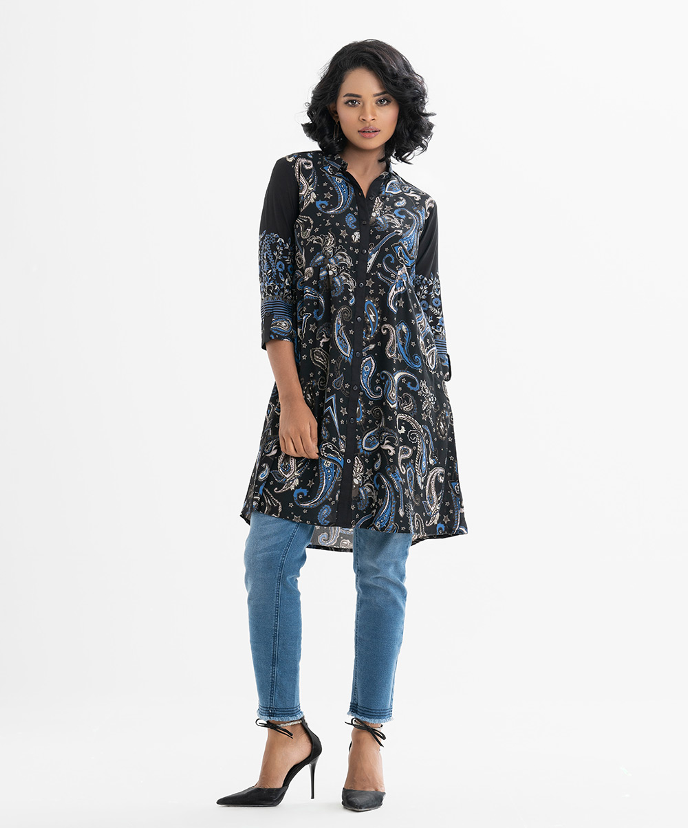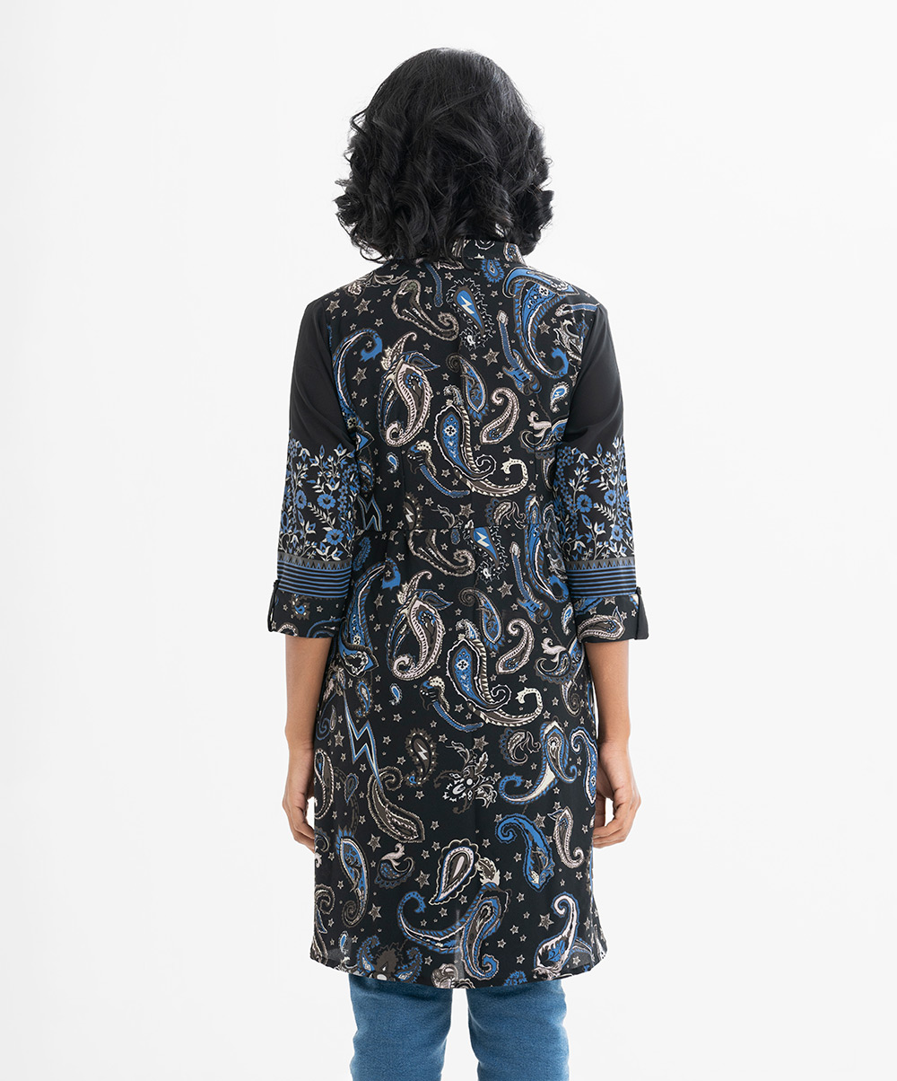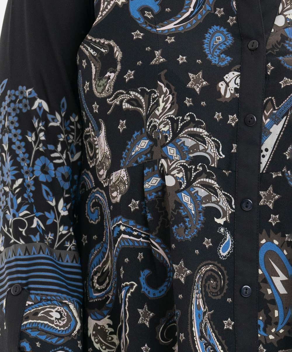 Women’s shirt style tunic in paisley printed georgette fabric. Classic collar, three-quarter roll-up sleeves.