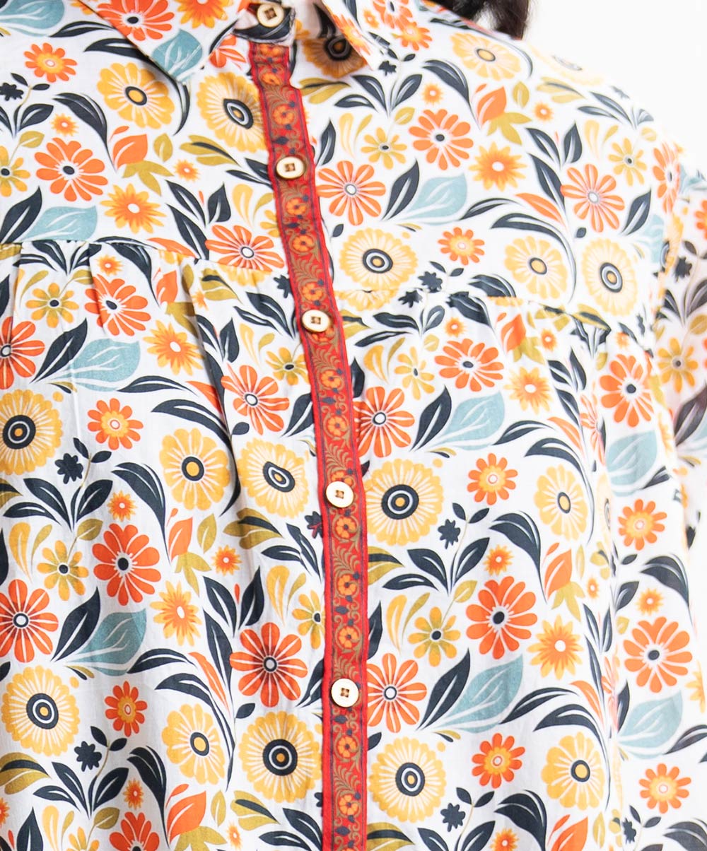 Women’s A-line tunic in printed cotton fabric. Classic shirt collar, three-quarter sleeves, tiered hem and buttons opening at front.
