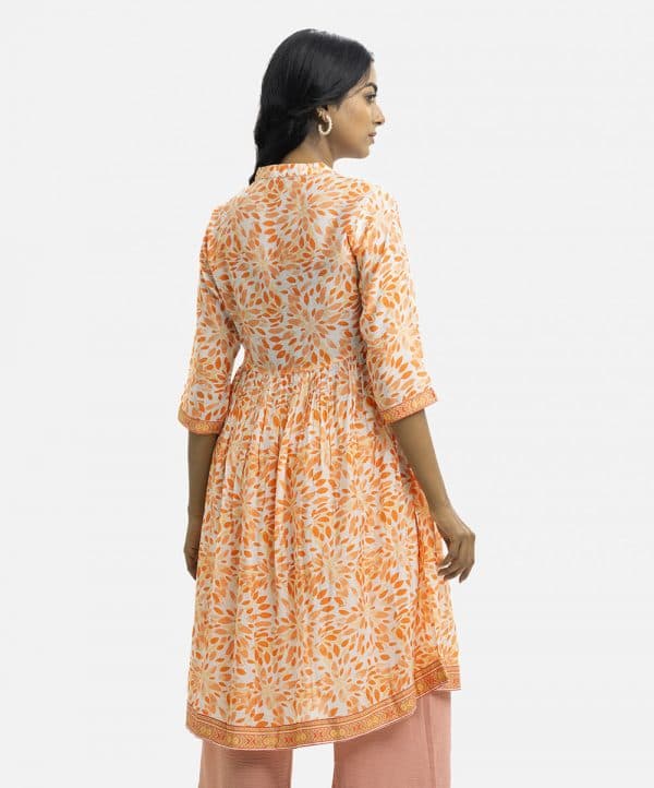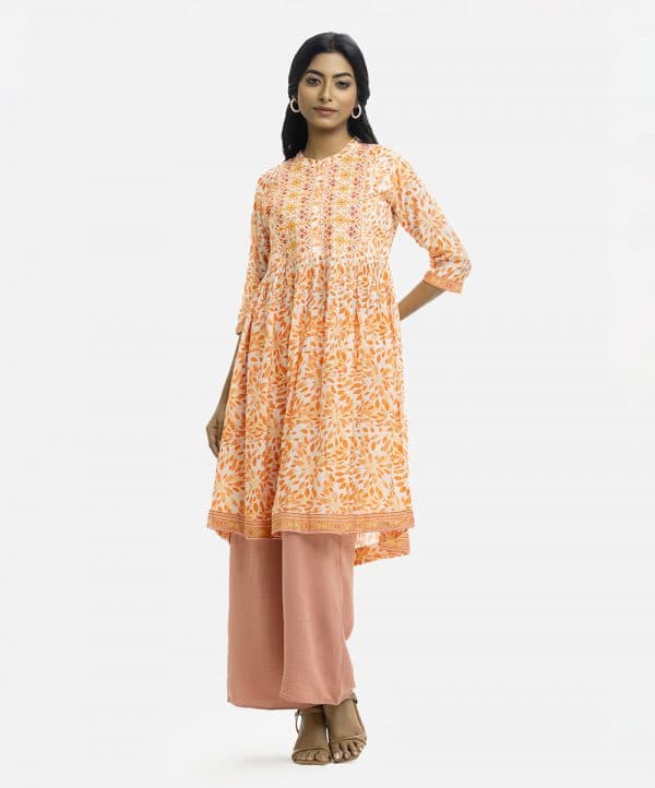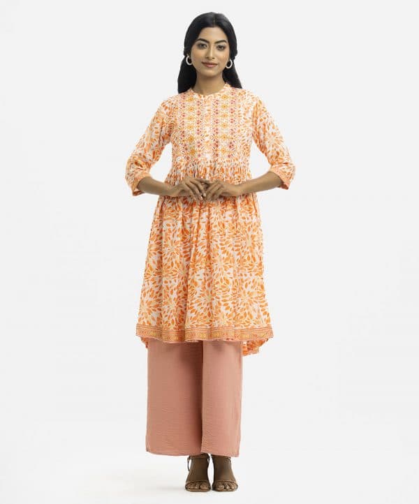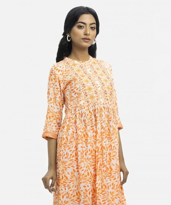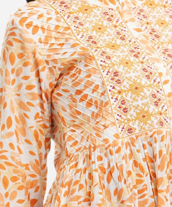 Women’s printed A-line tunic in rayon blended fabric. Stand collar, three-quarter sleeves. Embroidery & pintuck at front.