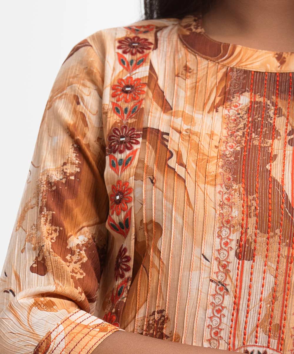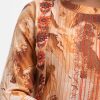 Women’s printed A-line tunic in blended cotton fabric. Mock neck, three-quarter sleeves. Pintuck and embroidery at front and sleeves.