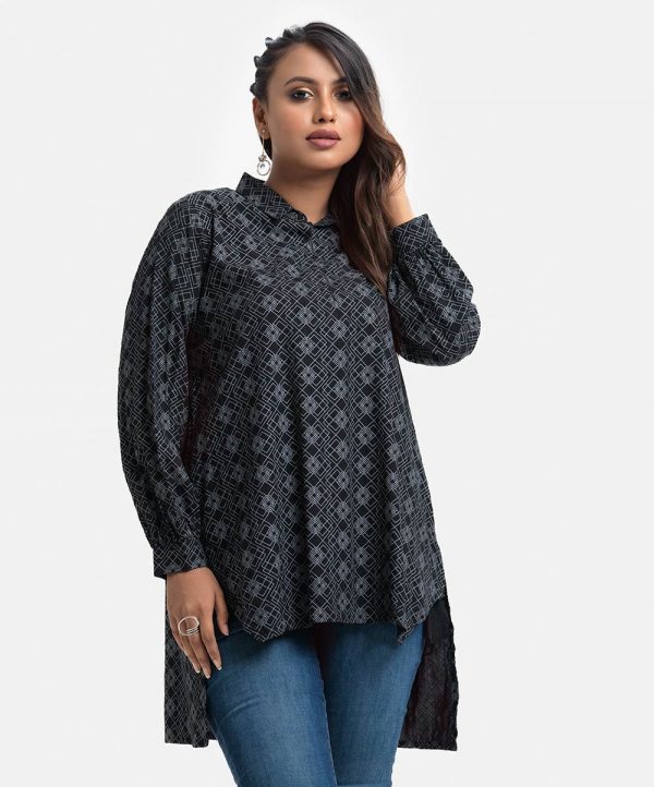 Women’s shirt style short printed tunic in viscose fabric. Classic collar, full cuff sleeves. High-low hem & inseam side pockets.