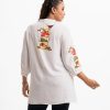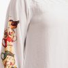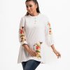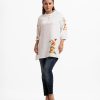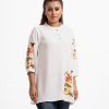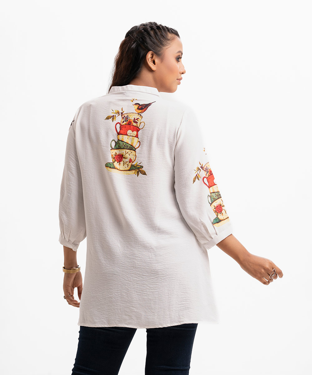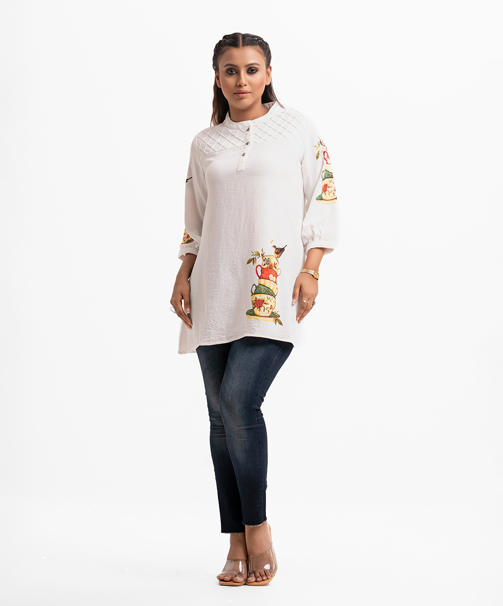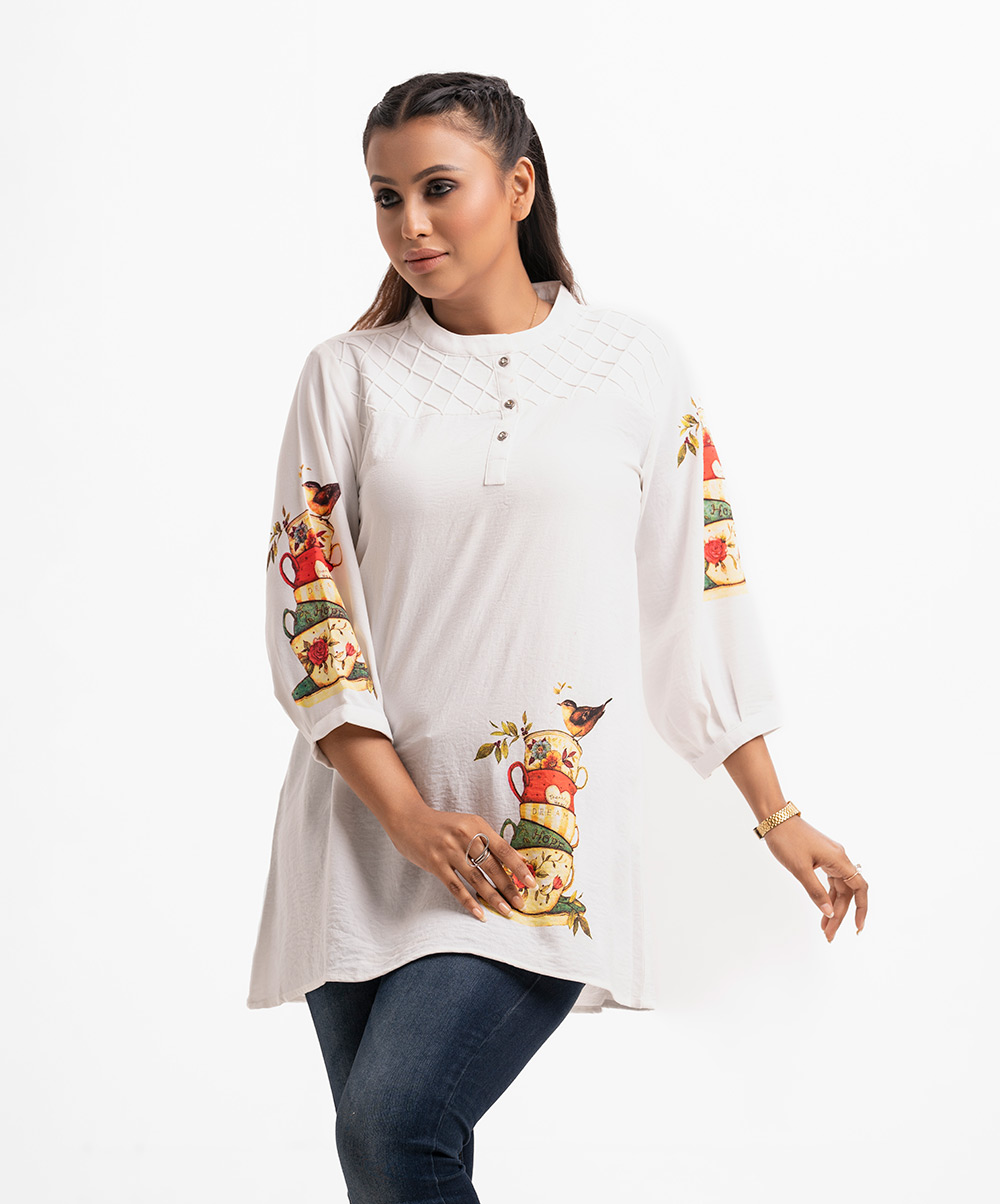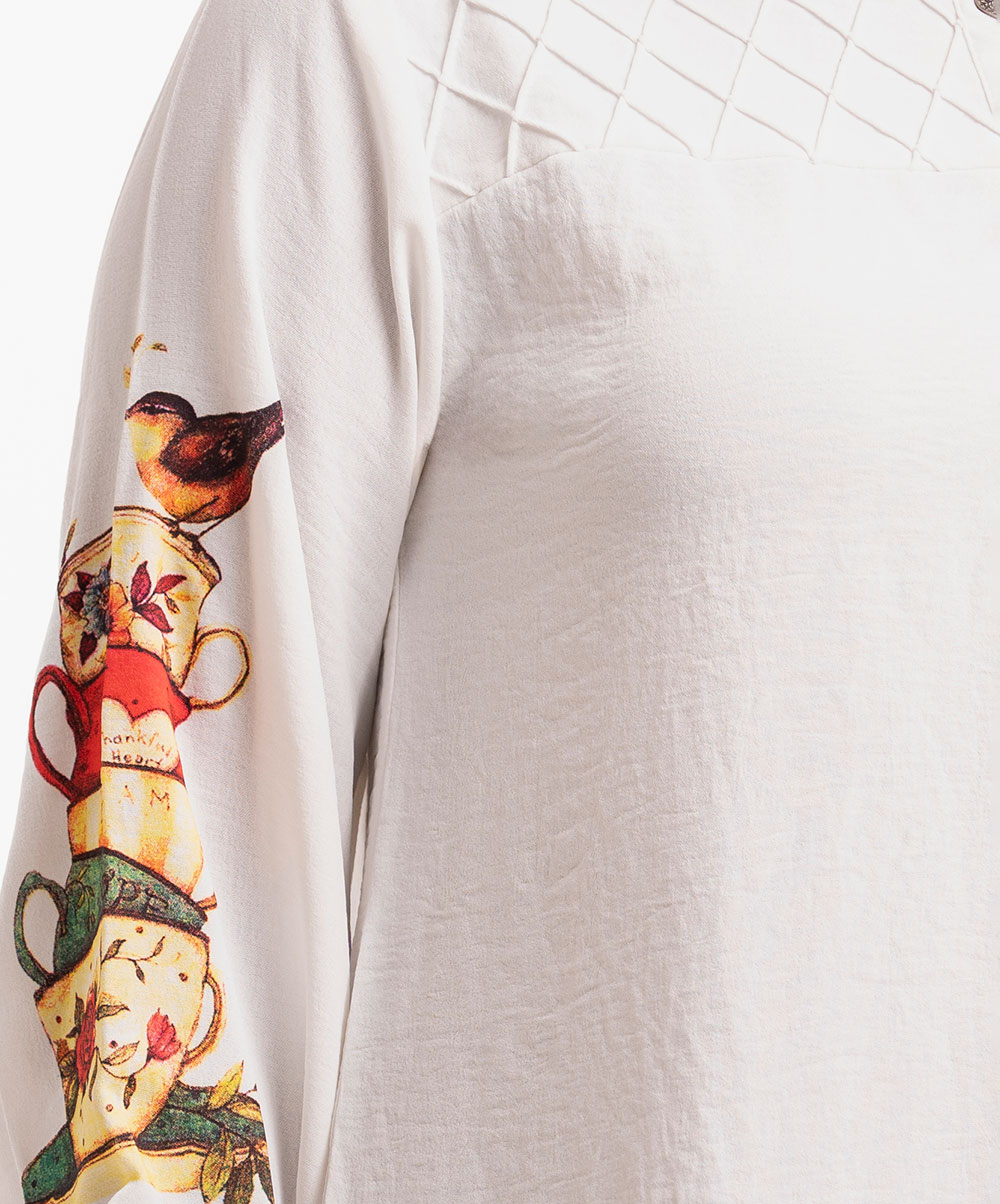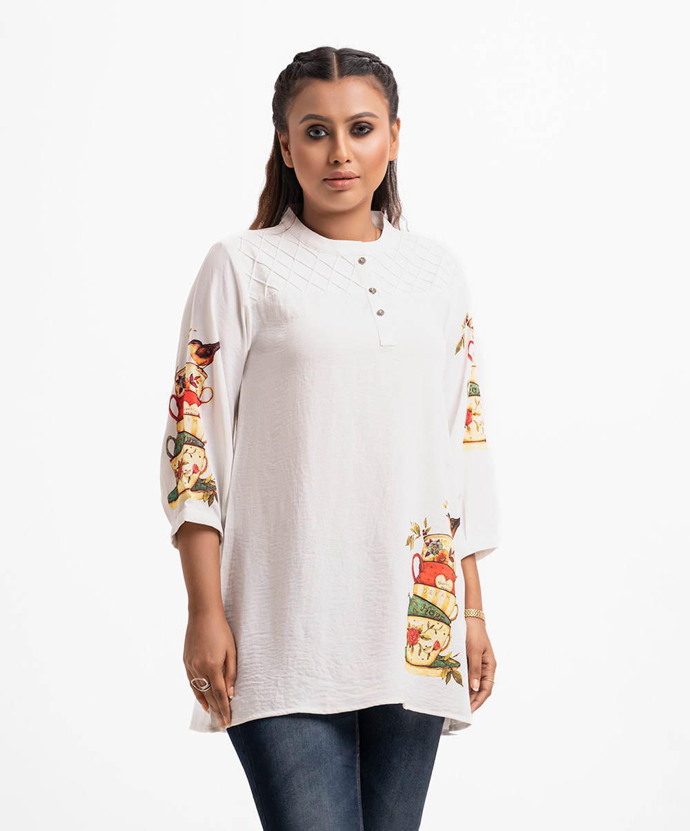 Women’s short tunic in stretchable georgette fabric. Stand collar, bishop sleeves. Pintuck and print detail at front.