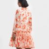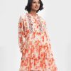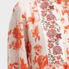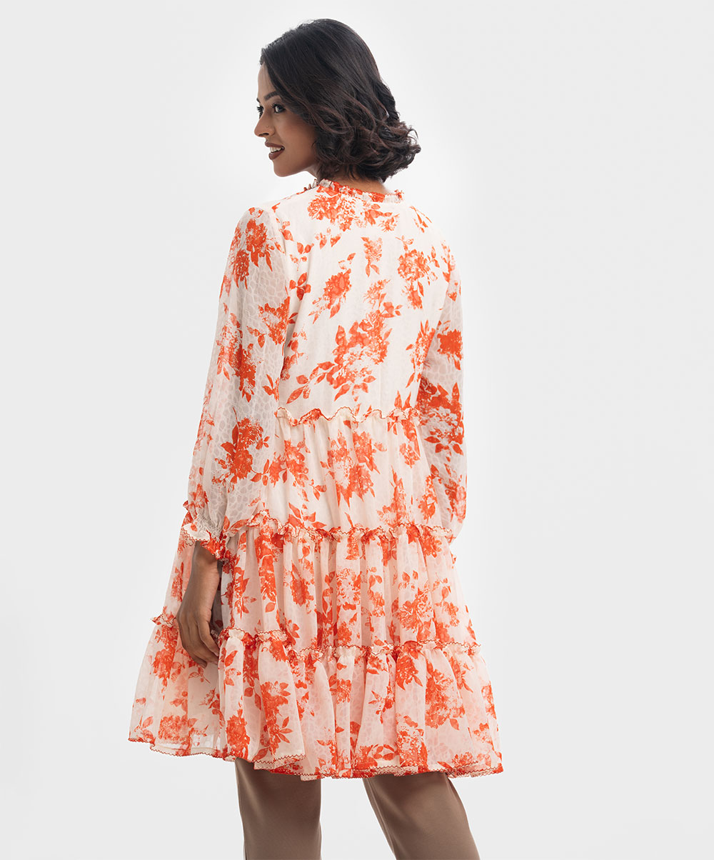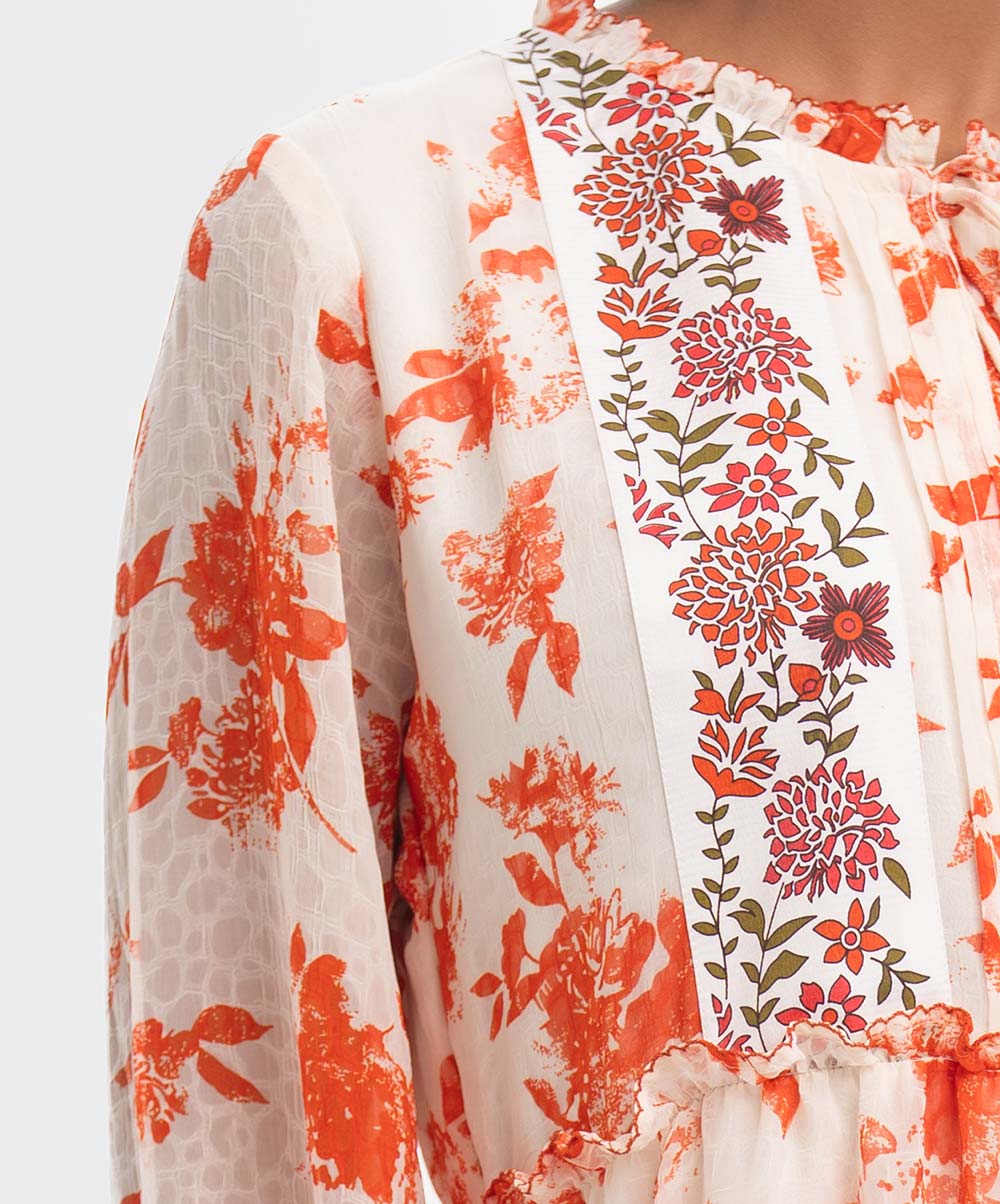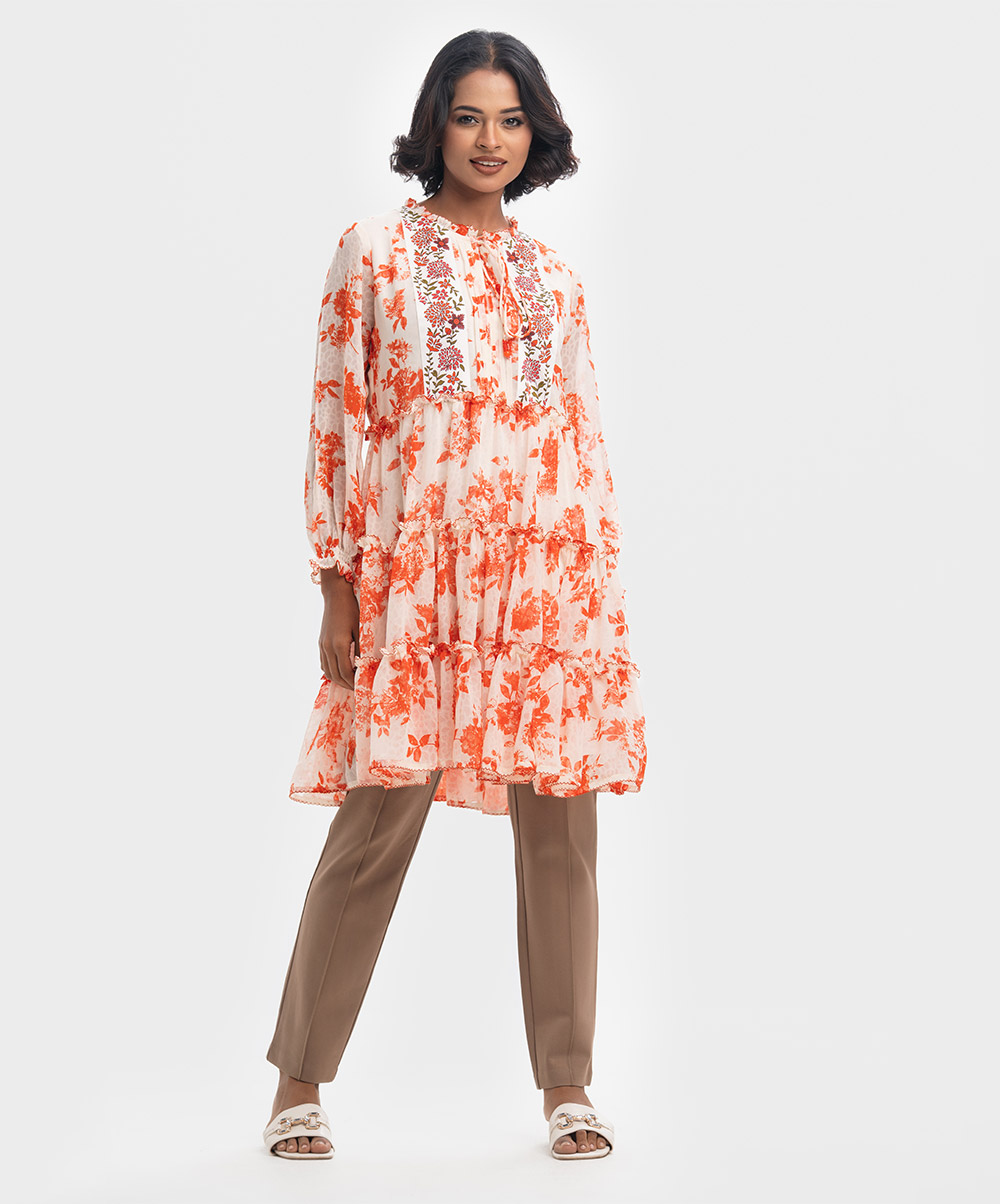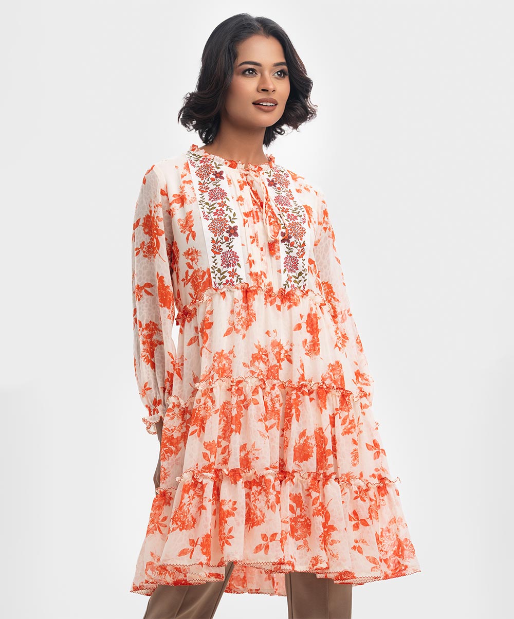 Off white and red tiered-style tunic in georgette fabric with viscose lining. Embroidered patch at the front. Three-quarter puff sleeves, frilled round neck with jewelled cords.