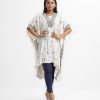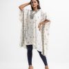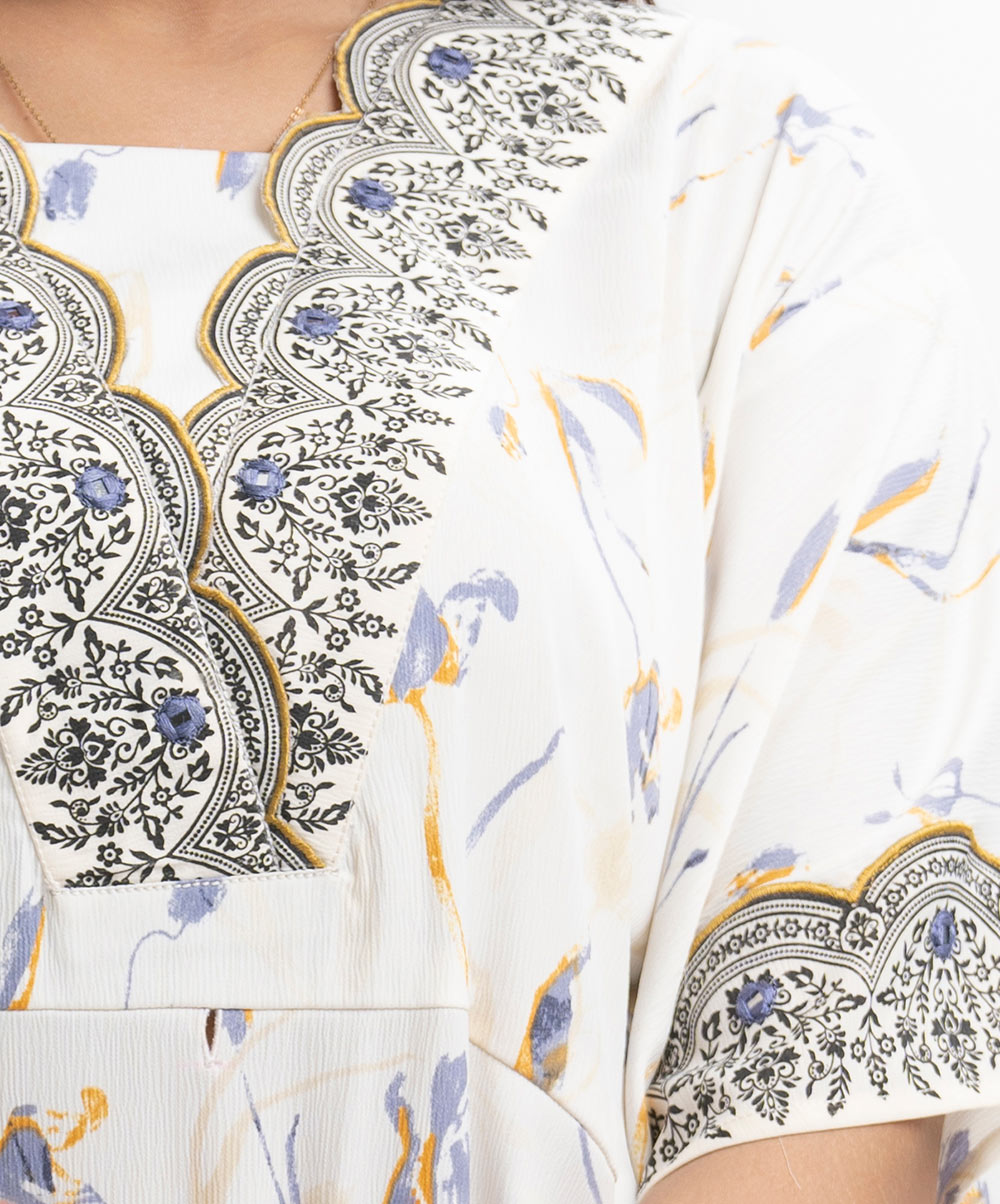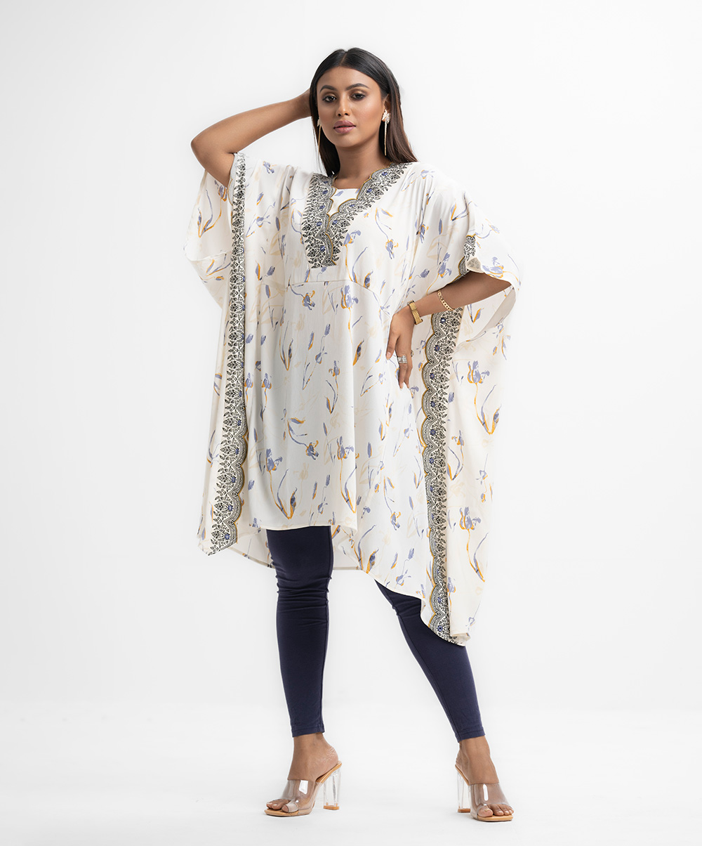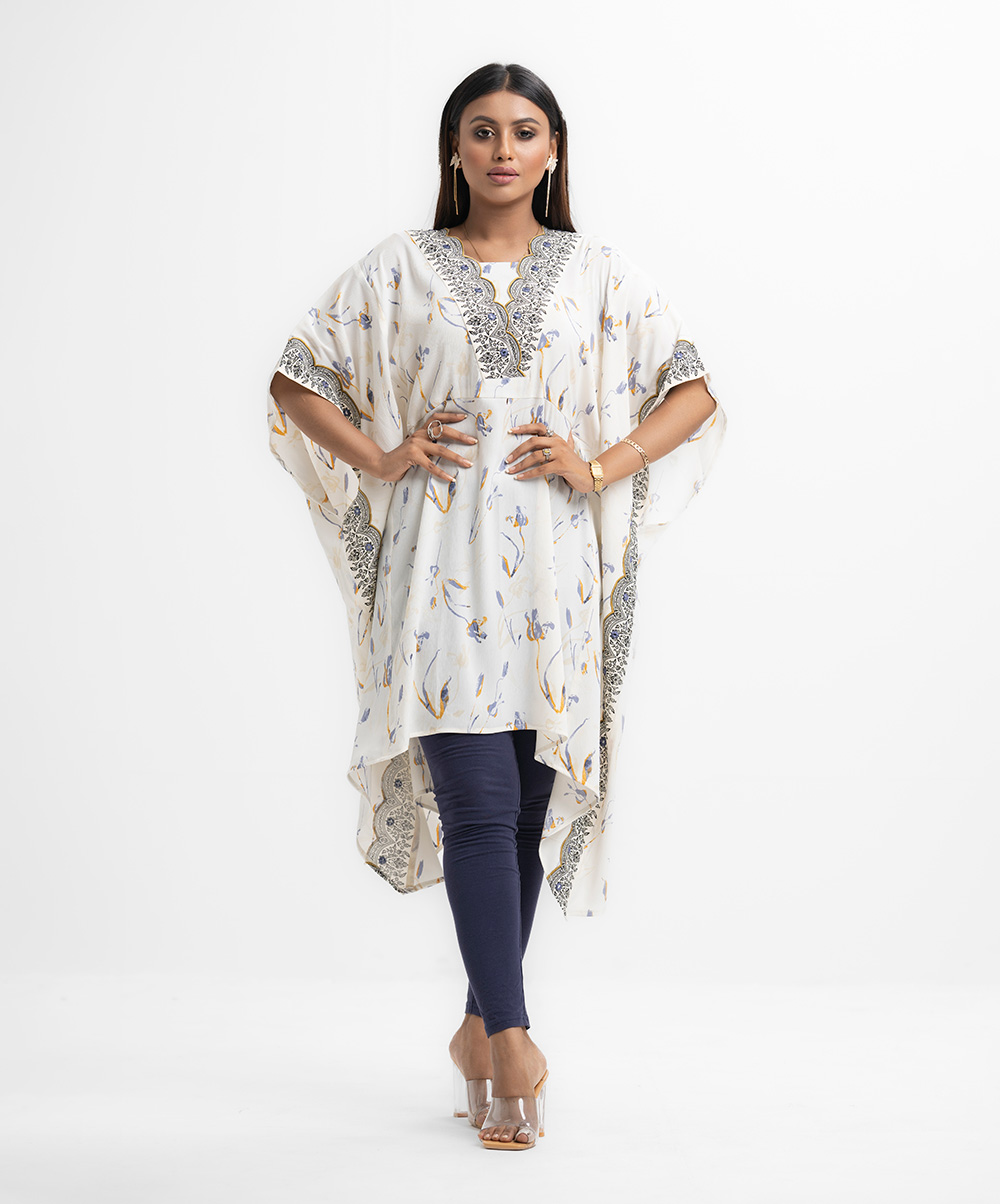 Women’s kaftan-style tunic in printed joom fabric. Cutwork patch & karchupi at neckline and side border.