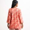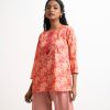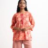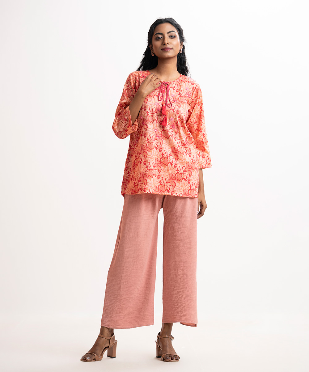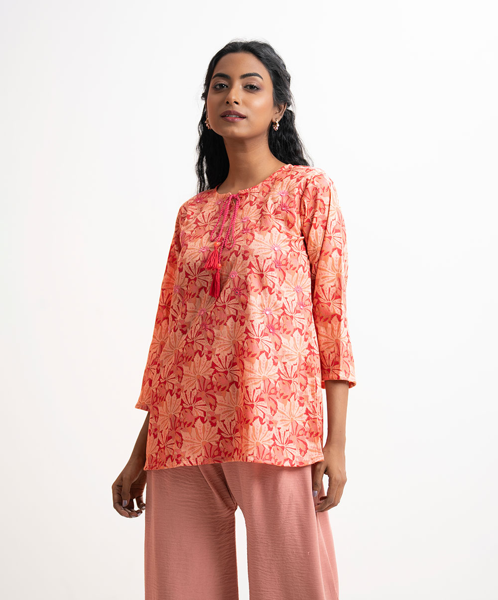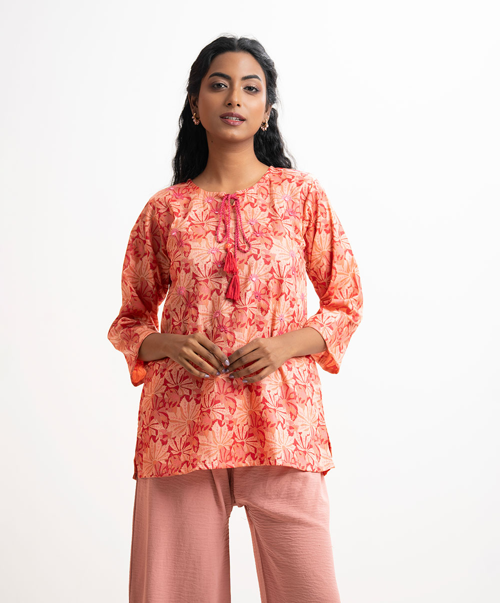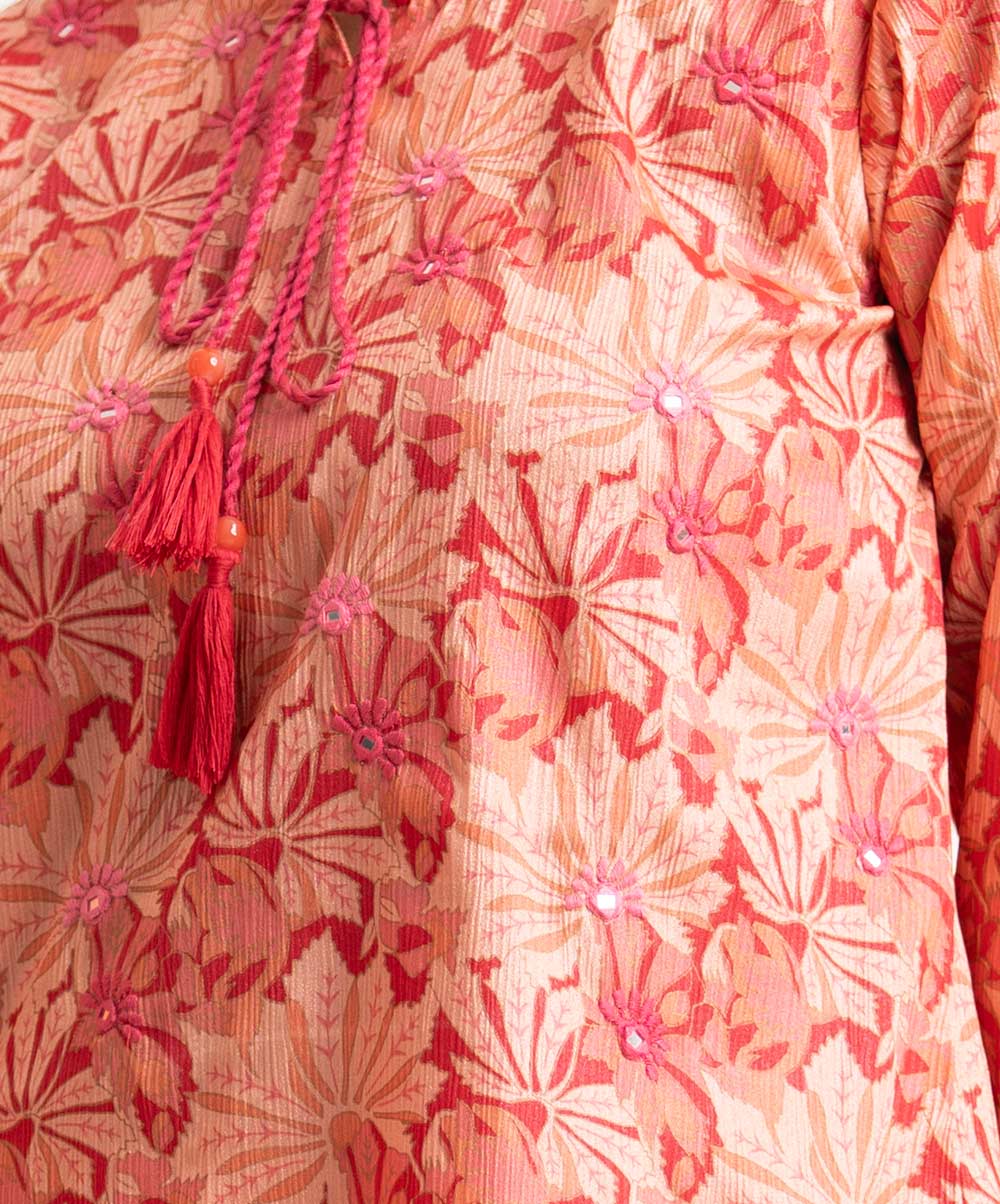 Women’s floral printed tunic in joom fabric. Round neck with tassel tie, three-quarter sleeves. Karchupi at front.