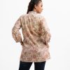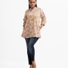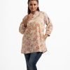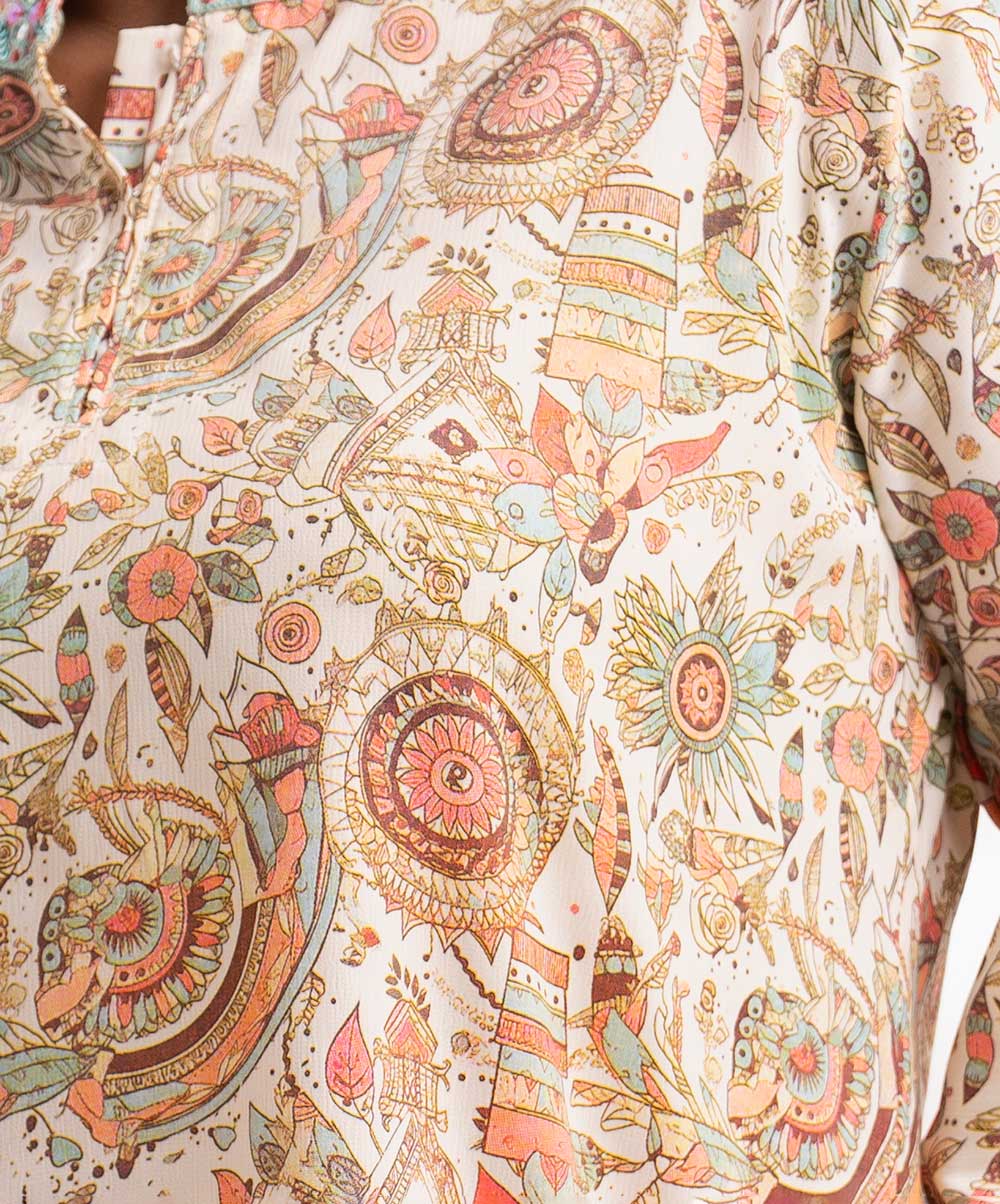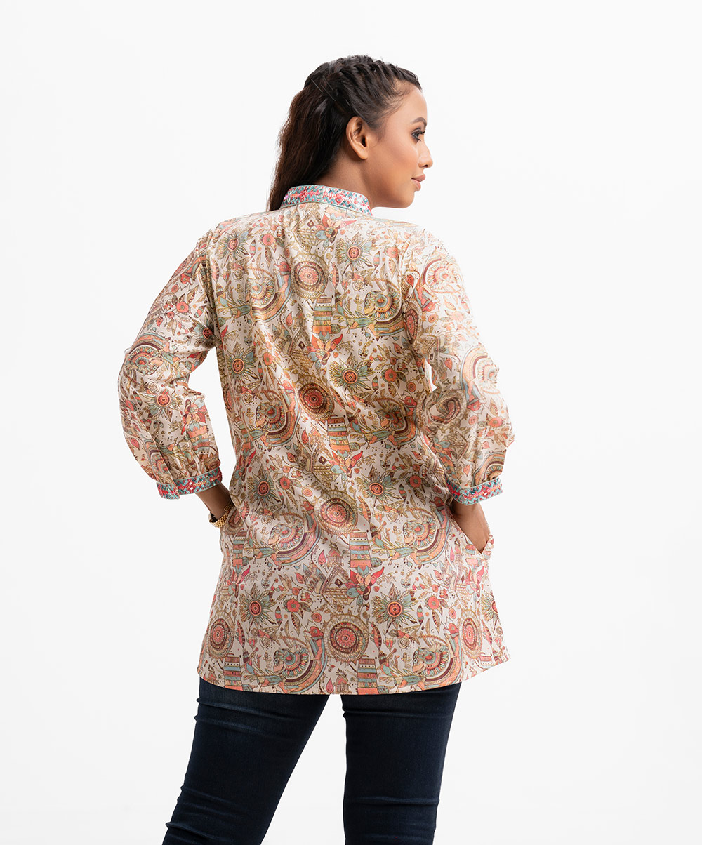 Women’s printed tunic in joom fabric. Mandarin collar with karchupi, three-quarter sleeves. Inseam side pockets.