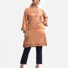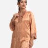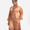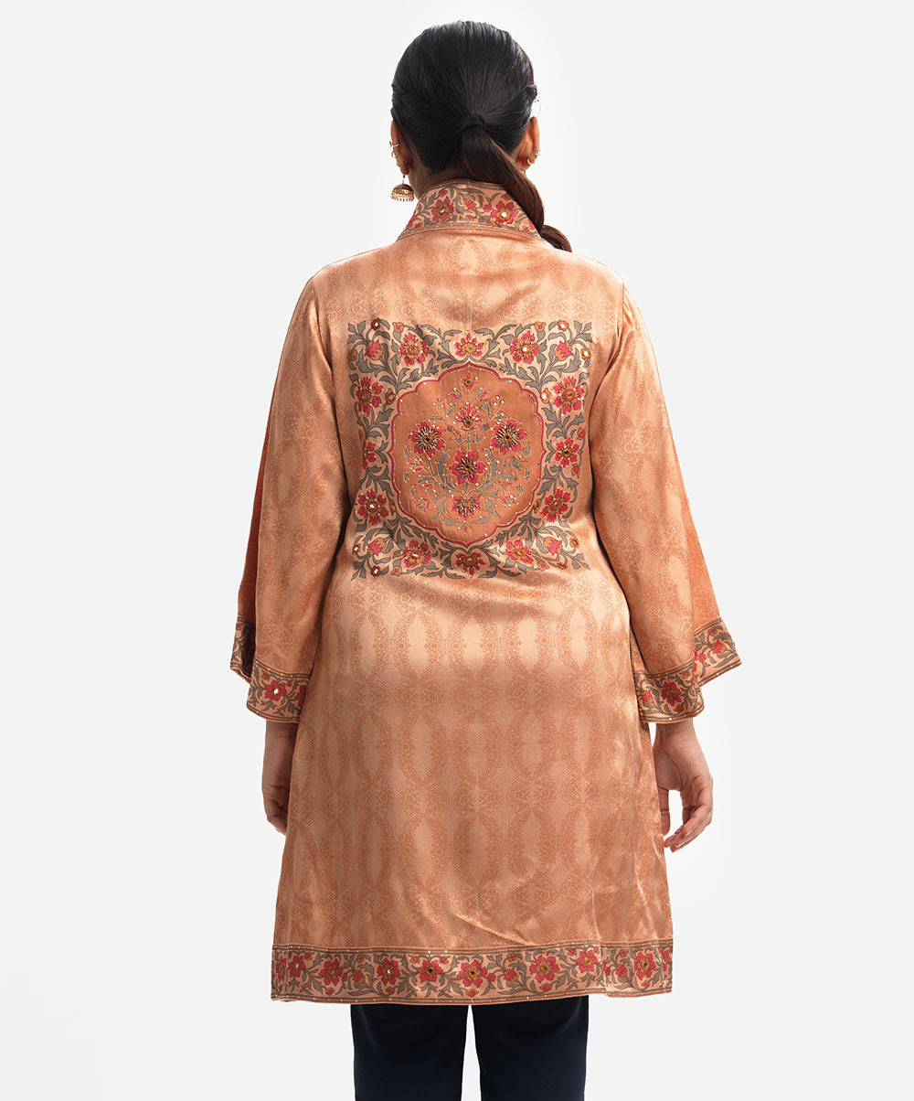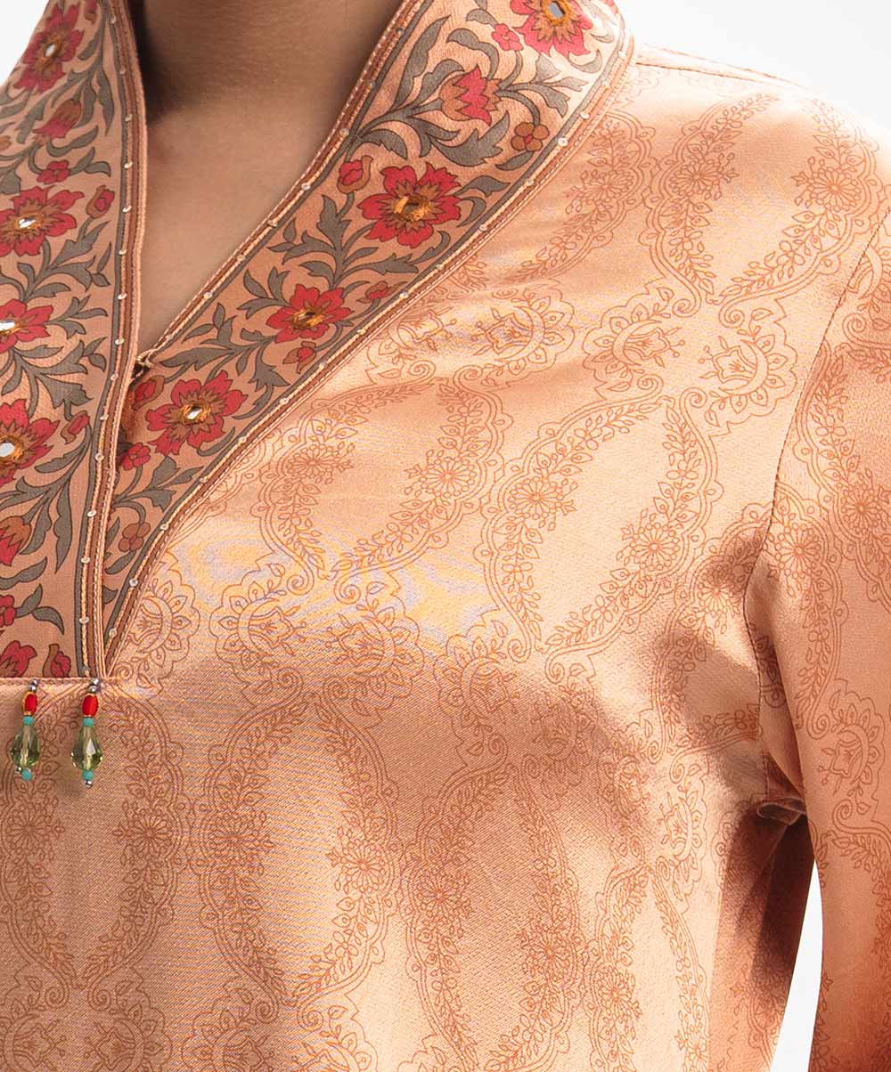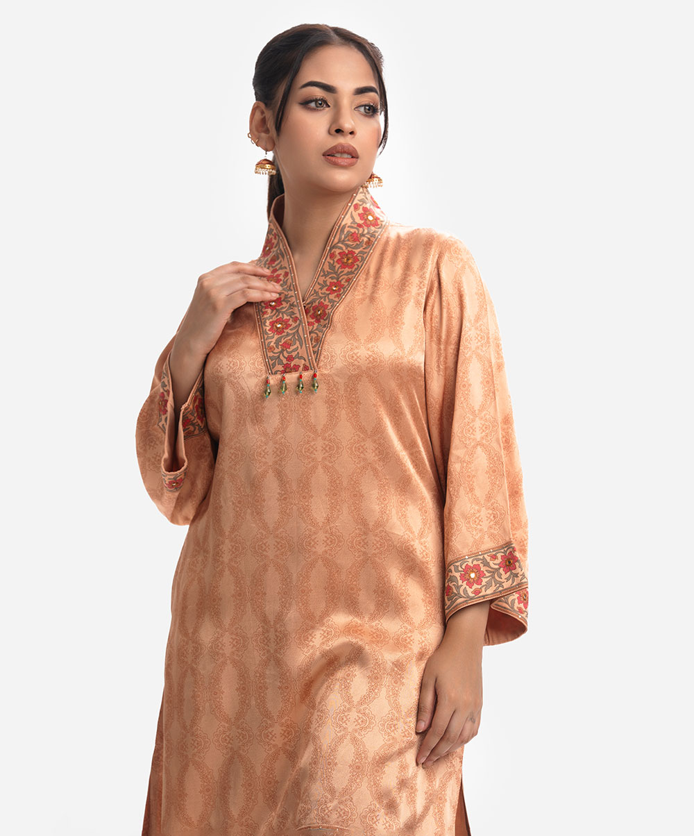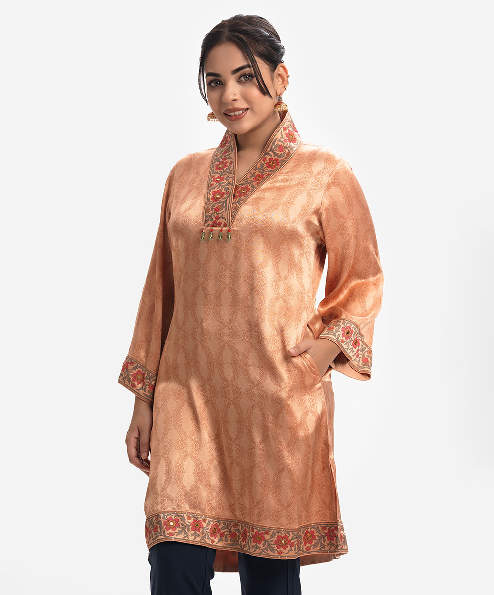 High collar V-neck tunic in silk-viscose fabric. Full sleeves, Karchupi at the front and cuffs.