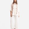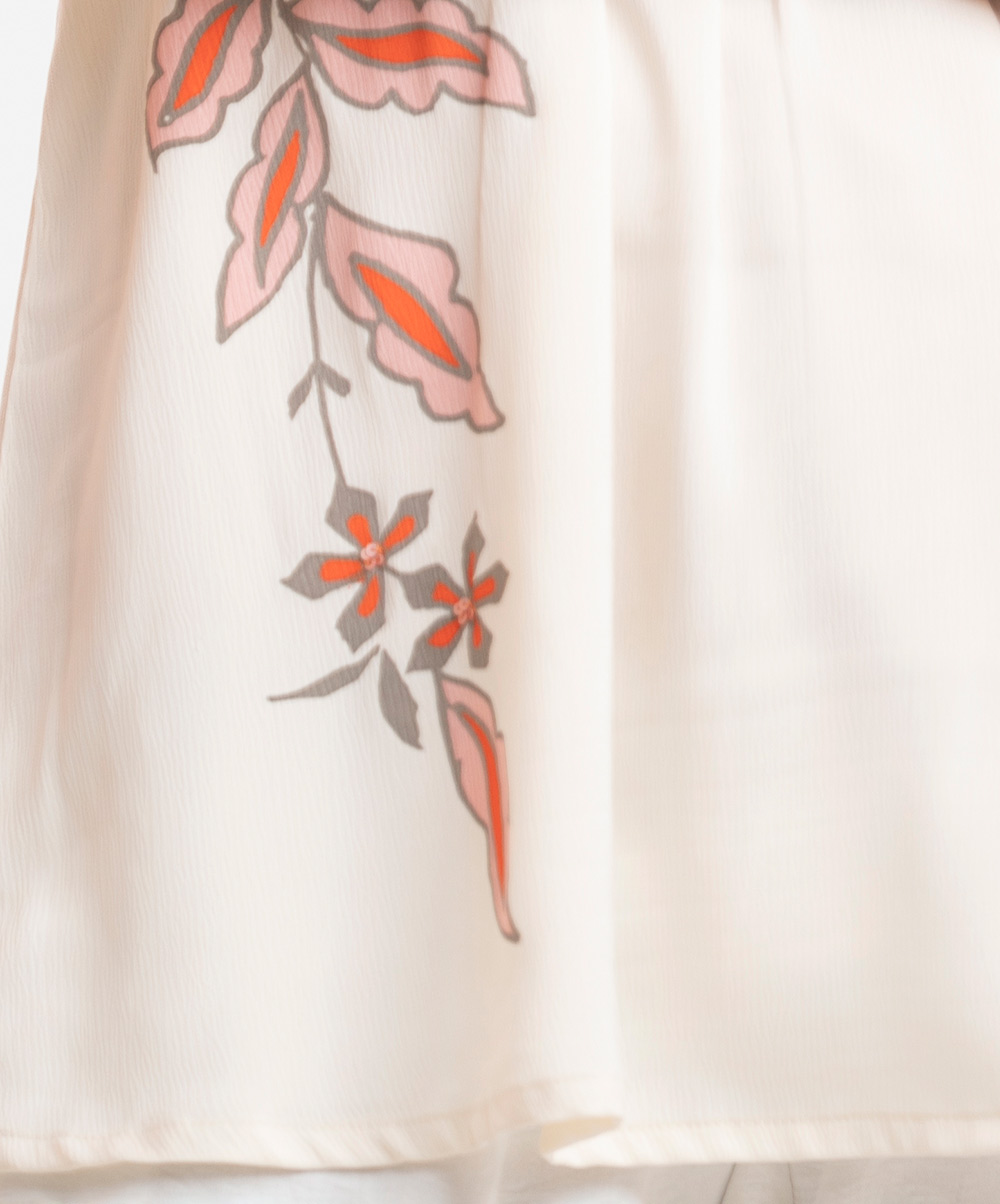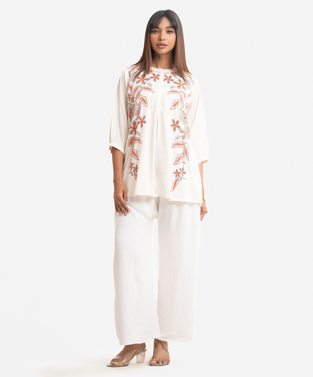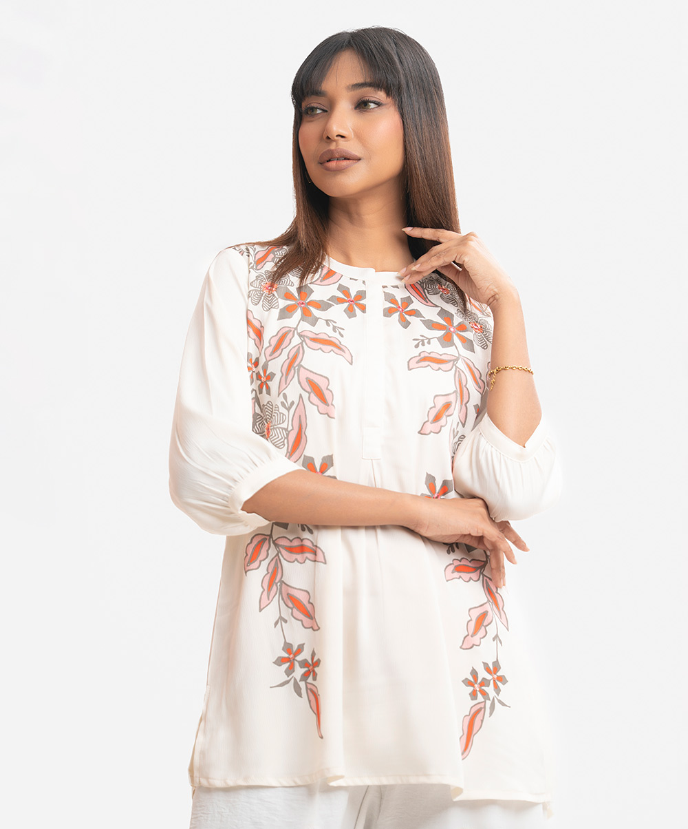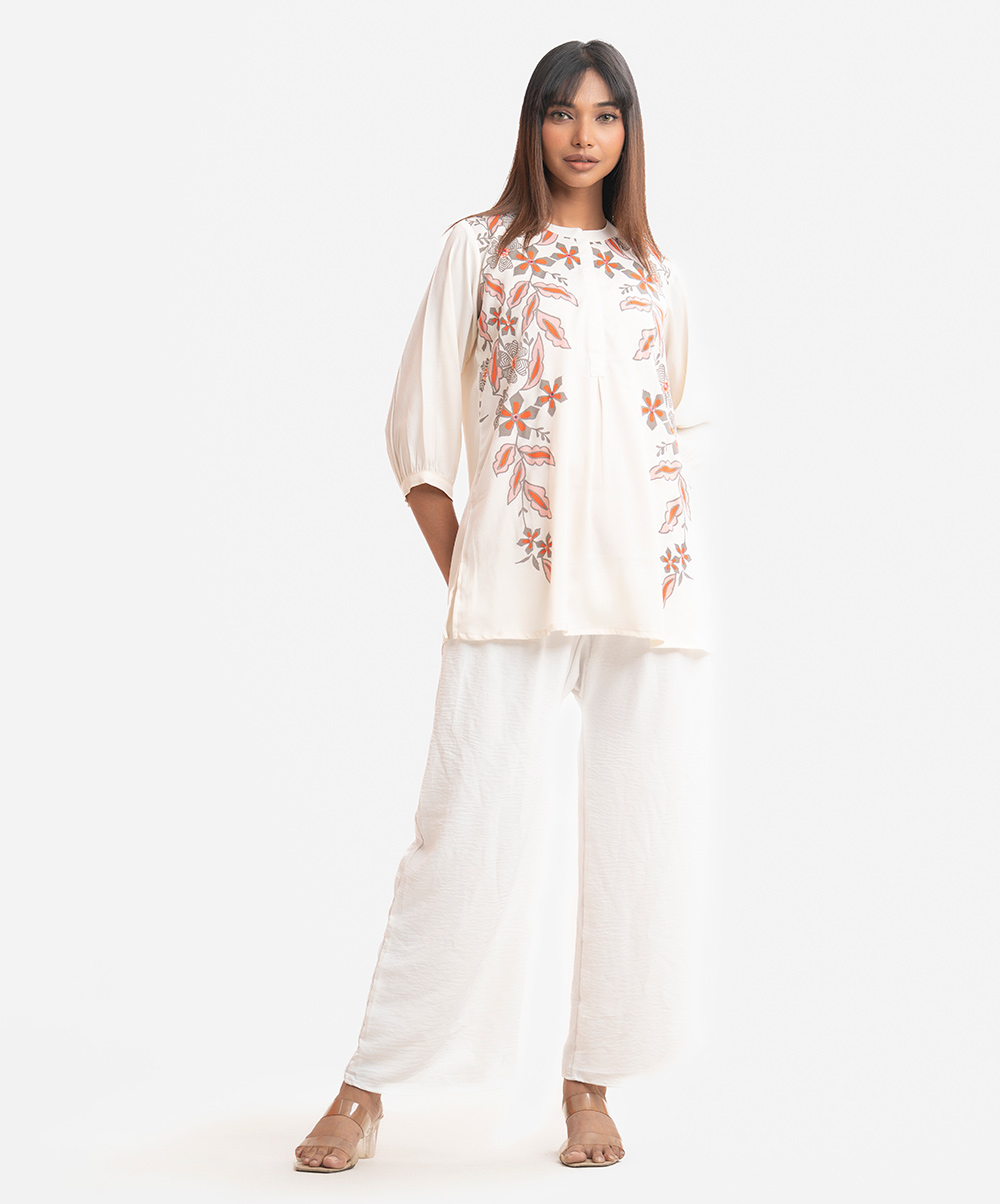 Woman’s printed A-line tunic in joom fabric. Three-quarter sleeves, stand collar. Karchupi at front.