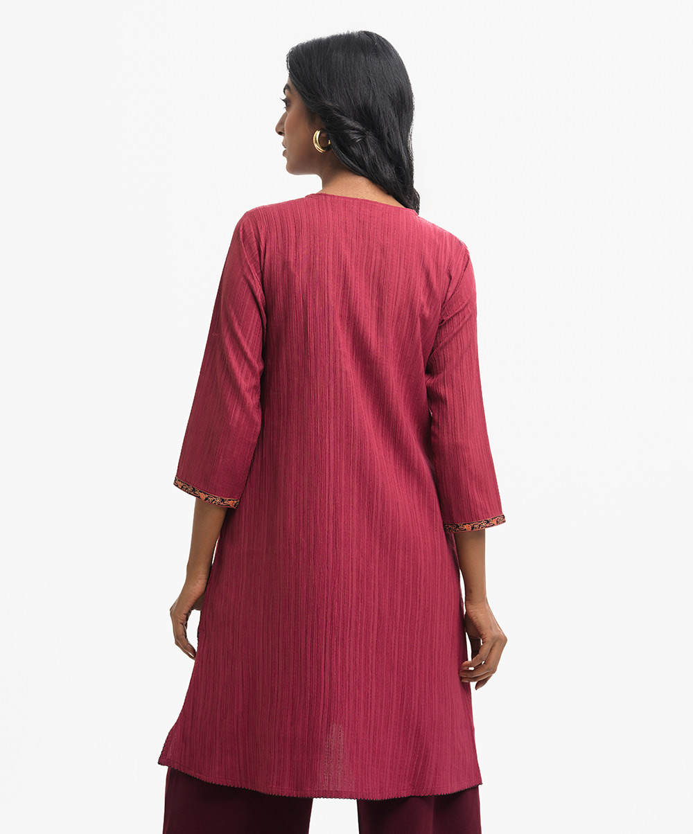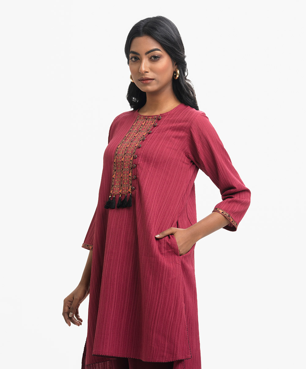 Round neck A-line tunic in blended crepe georgette fabric. Three-quarter sleeves, inseam side pockets.