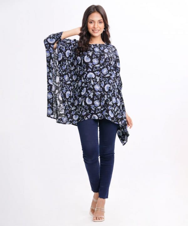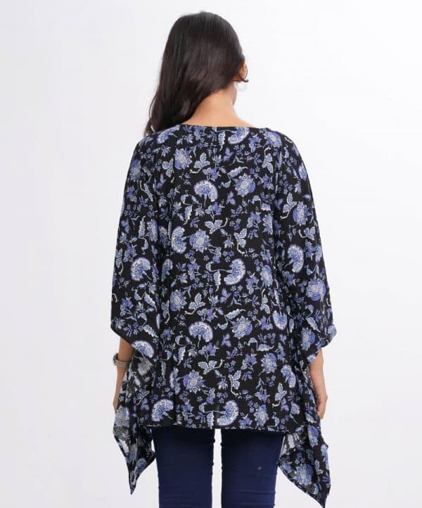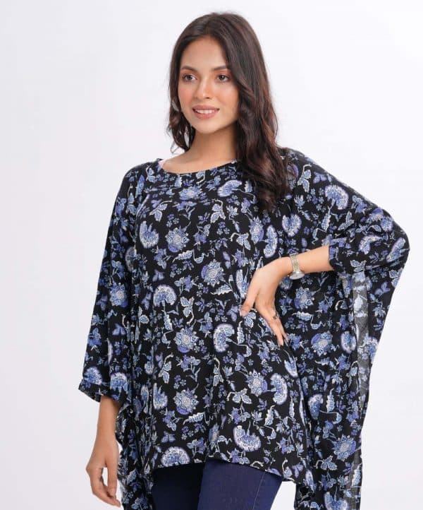 Black Kaftan style abaya Tunic in Swiss Cotton fabric. Designed with a round neck and Kimono sleeves.