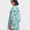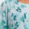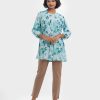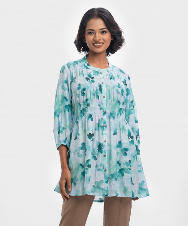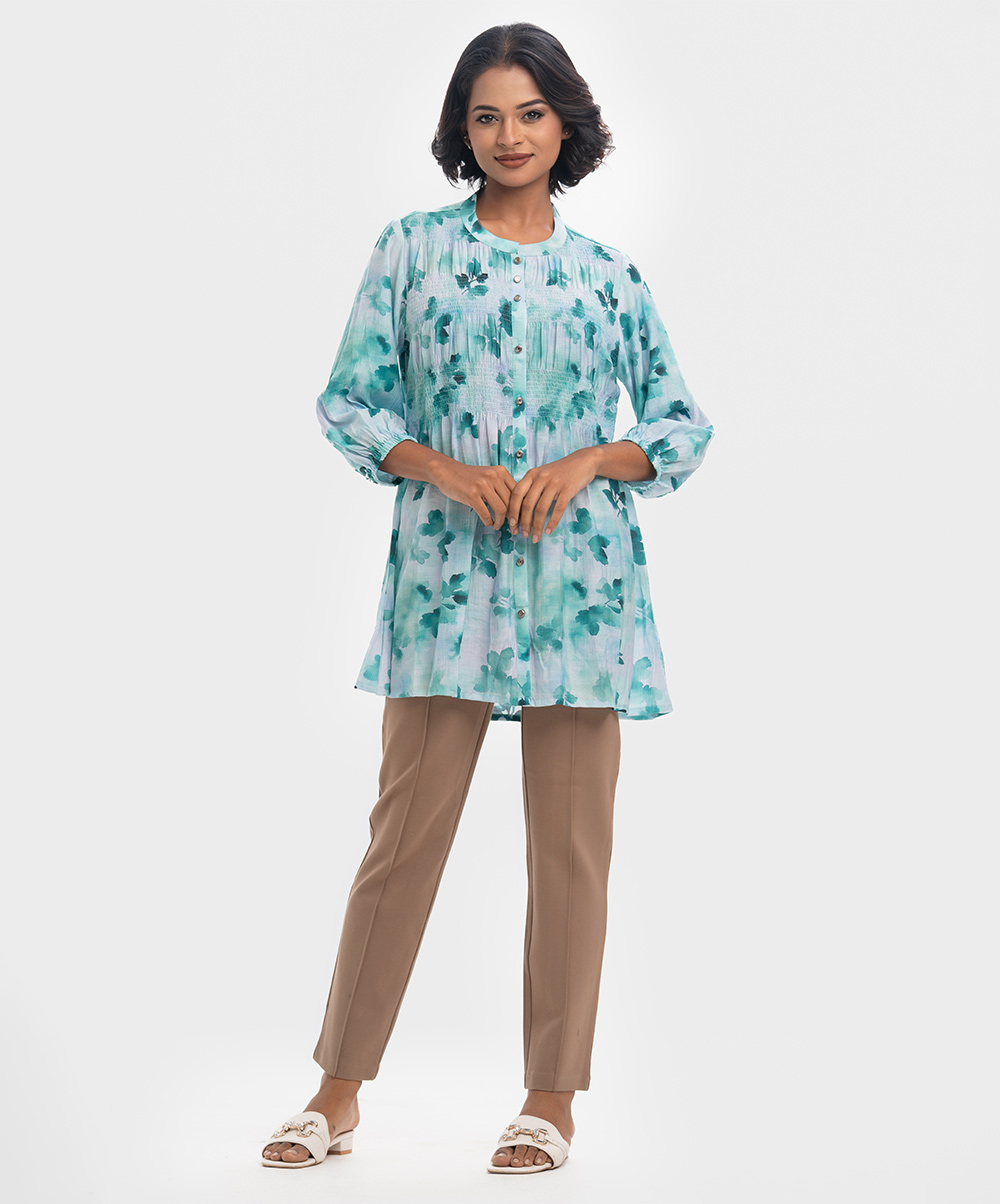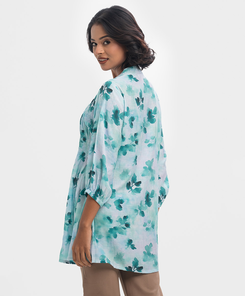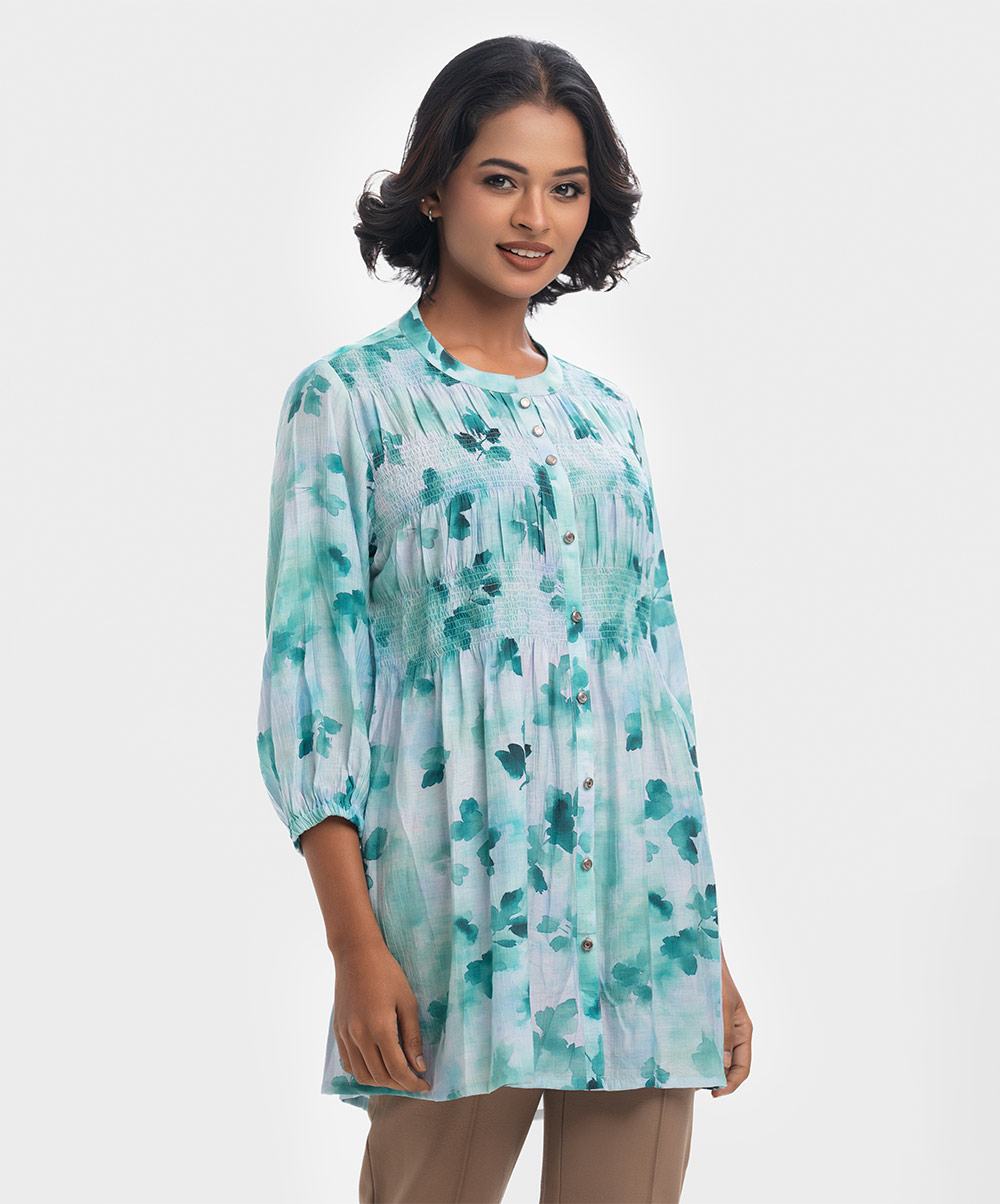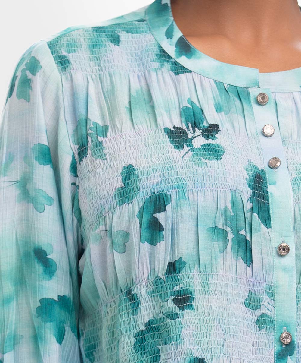 Band collar tunic in cotton-blend fabric. Smocked, three-quarter bishop sleeves.