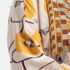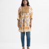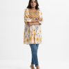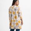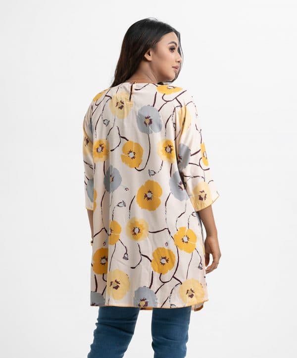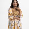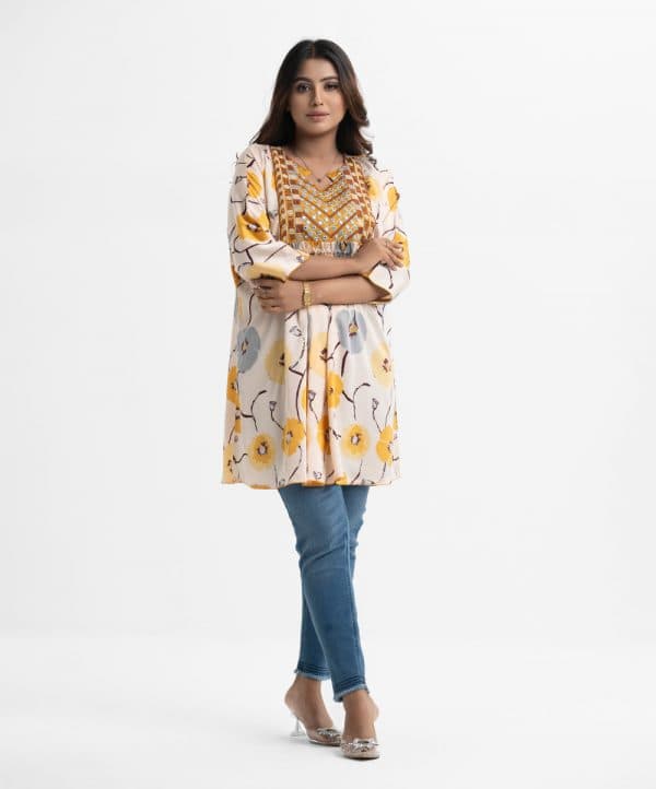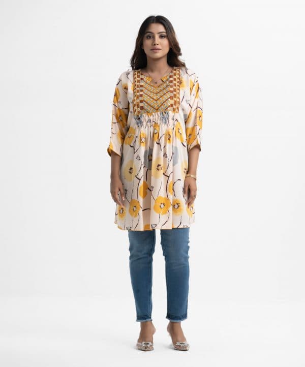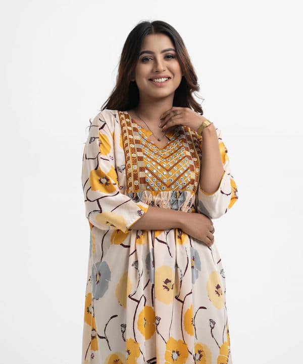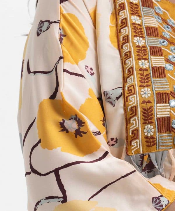 Women’s abaya style tunic in printed georgette fabric. Keyhole with V-neck, batwing sleeves. Karchupi and diamond pin tuck at front.