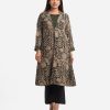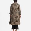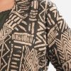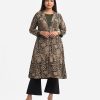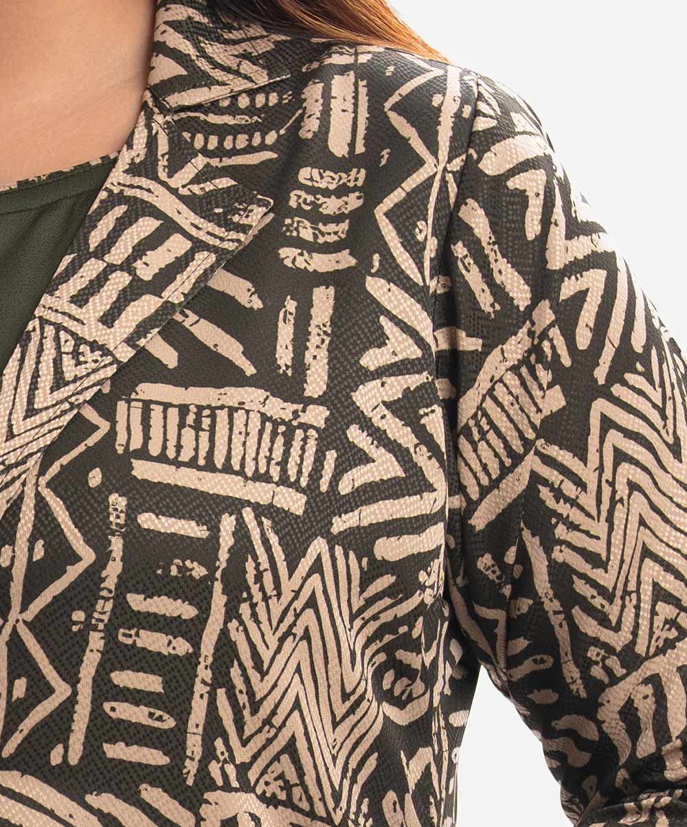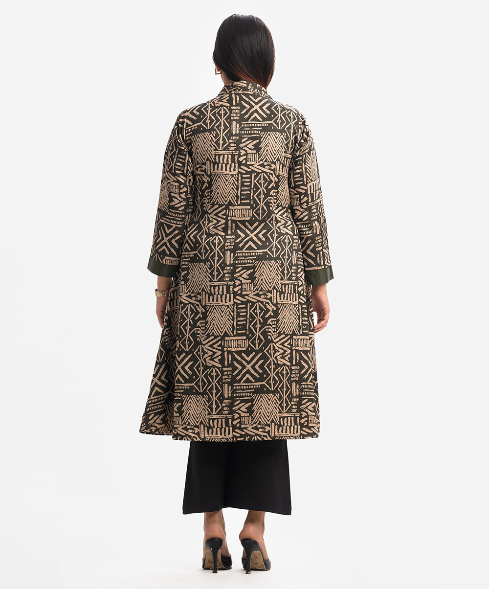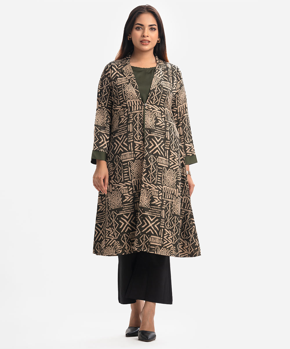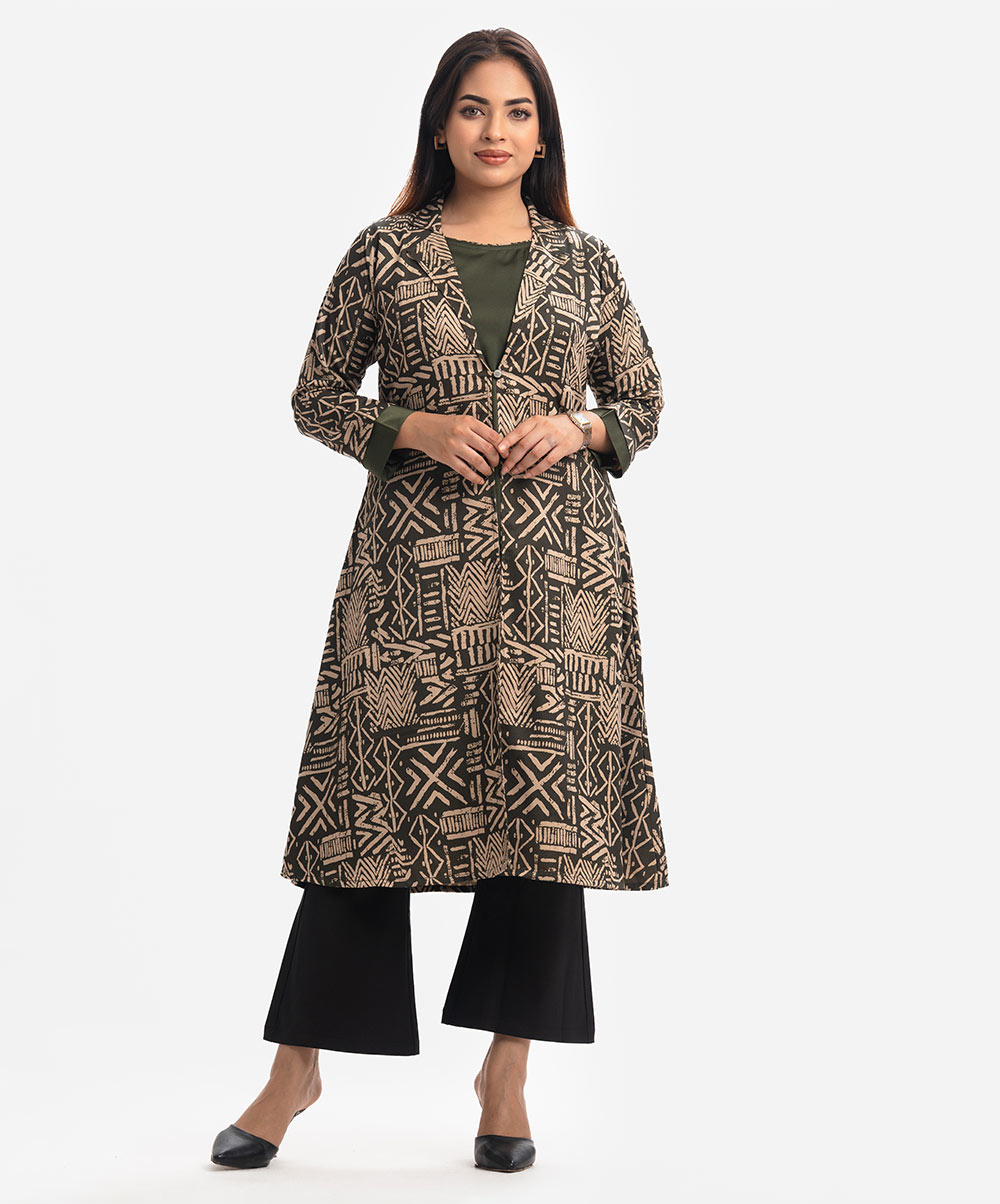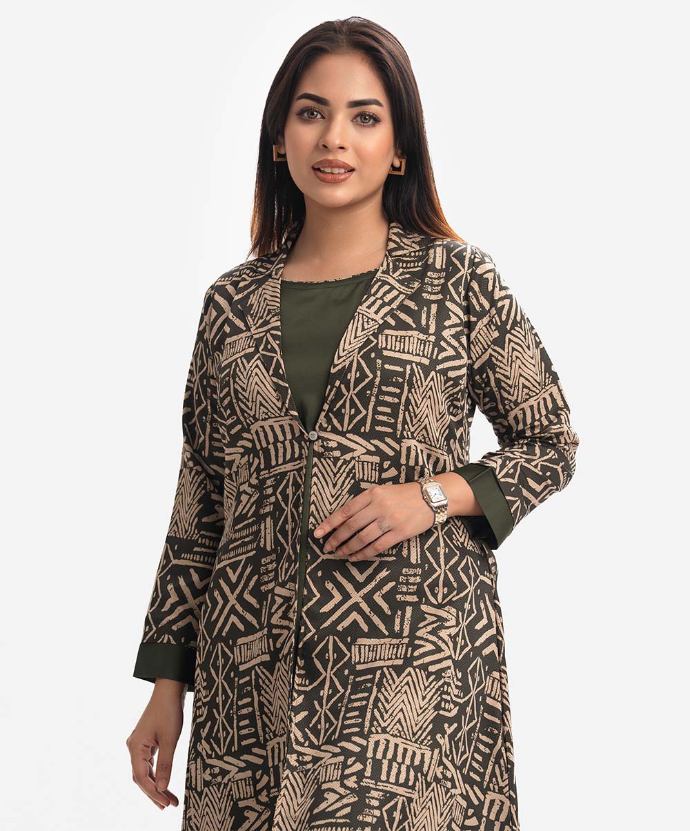 Lapel collar abaya-style tunic in poly-jacquard fabric. Full-sleeved, roundneck inner in soft crepe fabric.