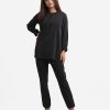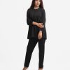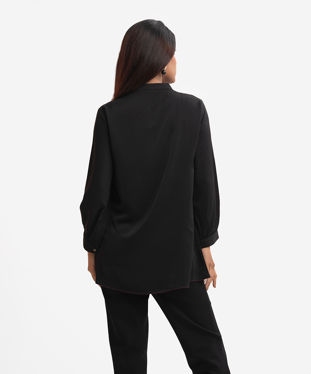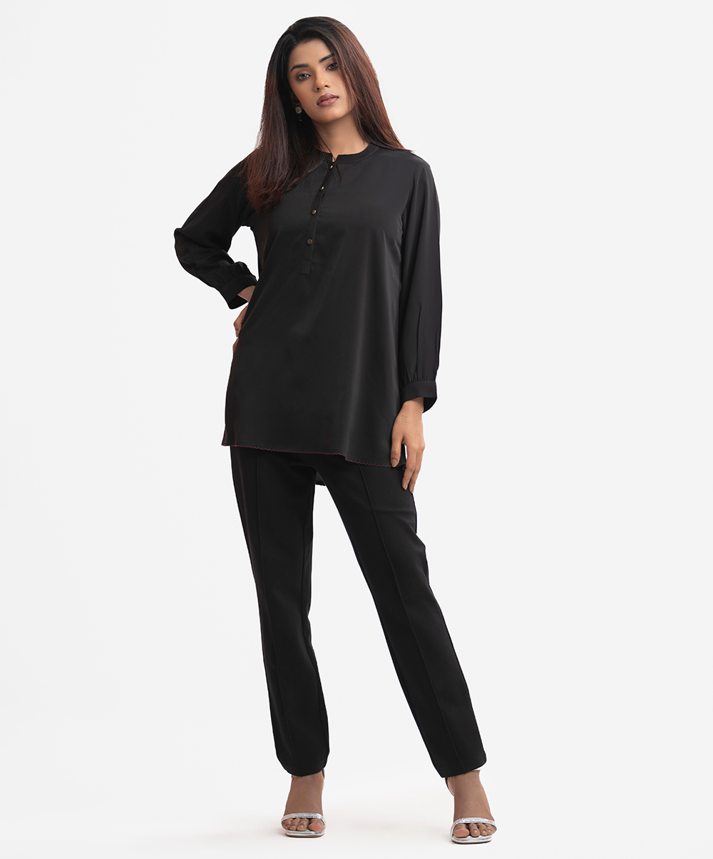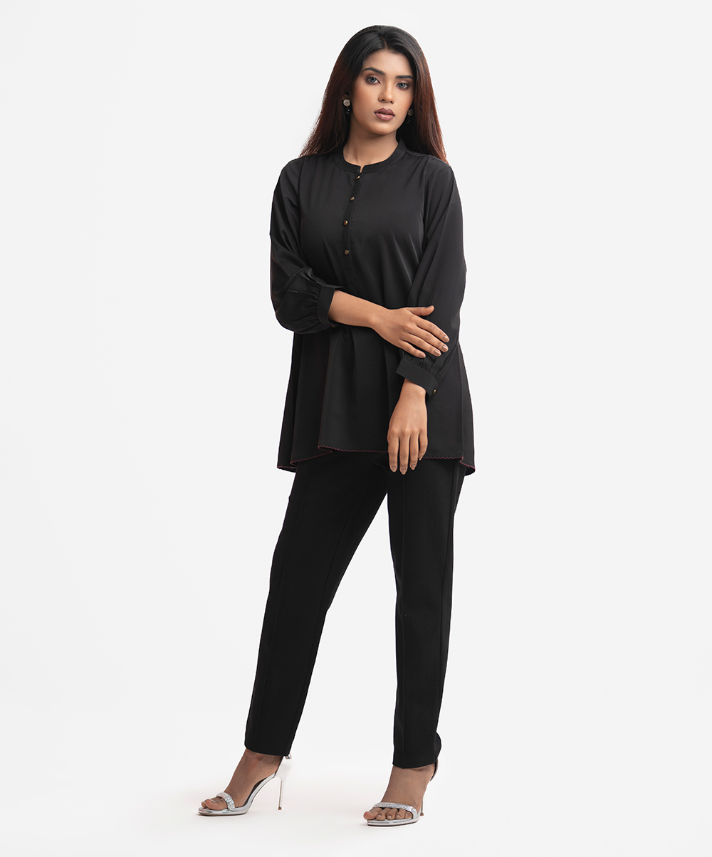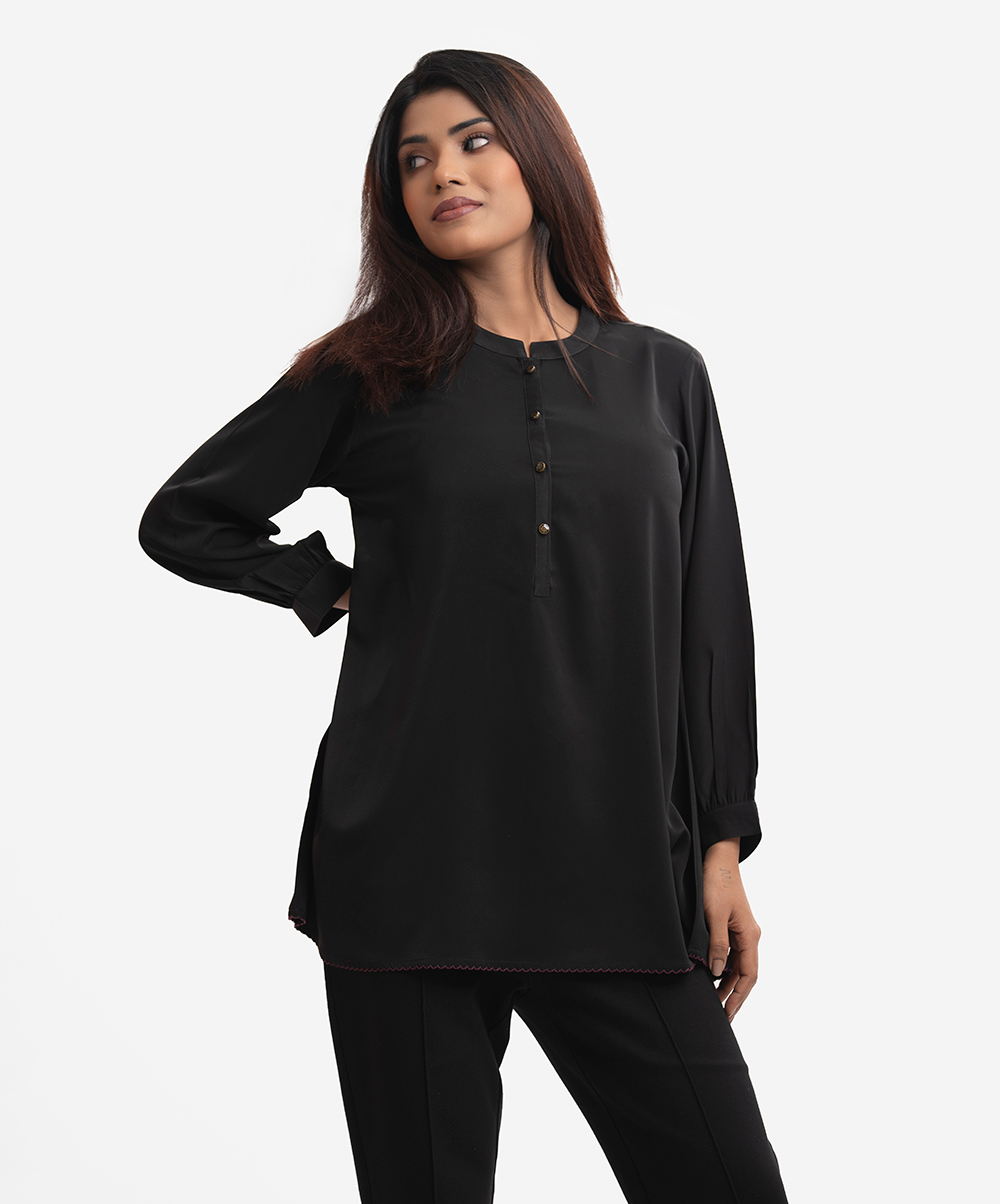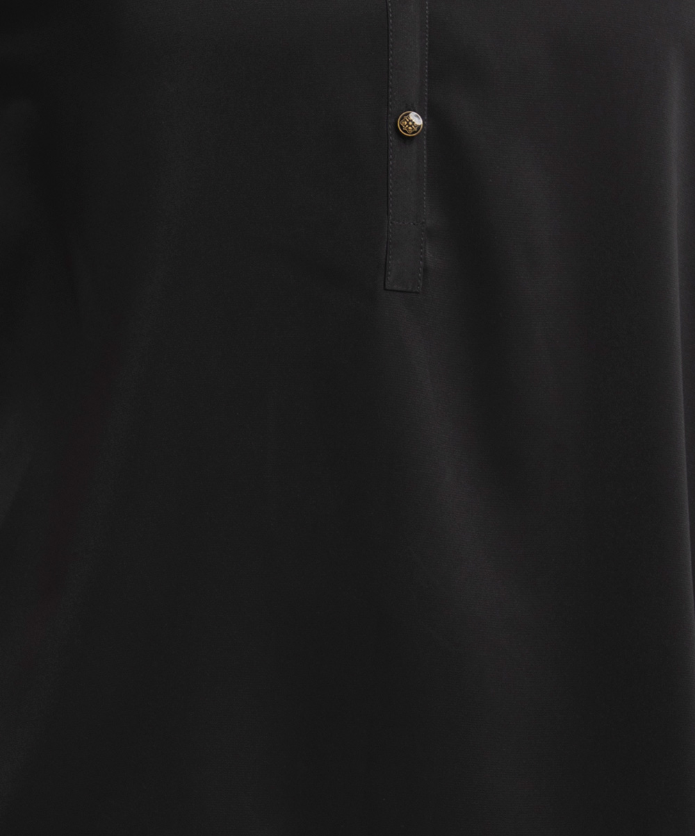 Women’s abaya-style tunic in textured georgette fabric. Stand collar, bishop sleeves. Buttons placket and floral print detail at front.