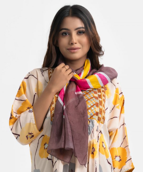 Women’s printed scarf in silk blended fabric.