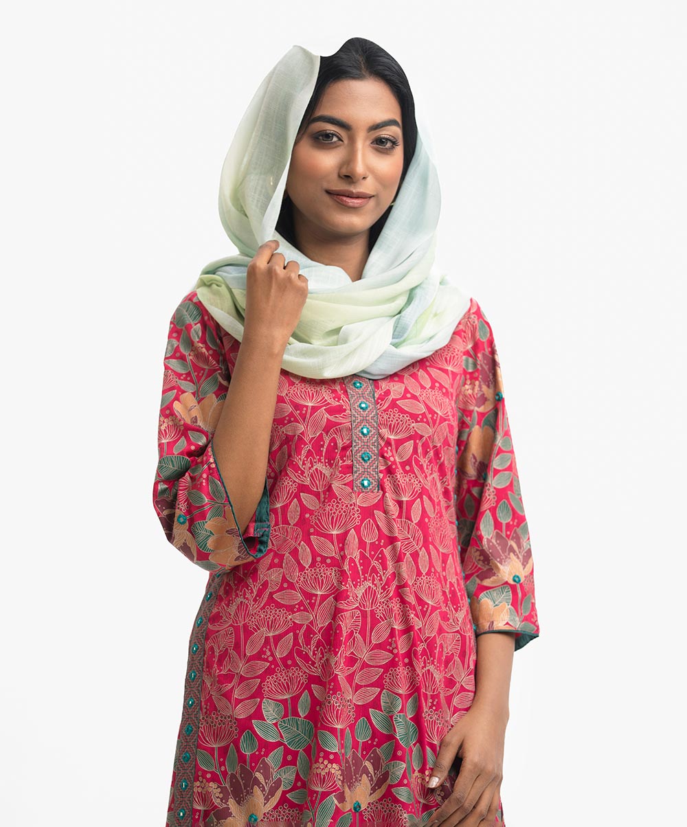 Women’s printed scarf in blended cotton fabric. Fringe trim at border.
