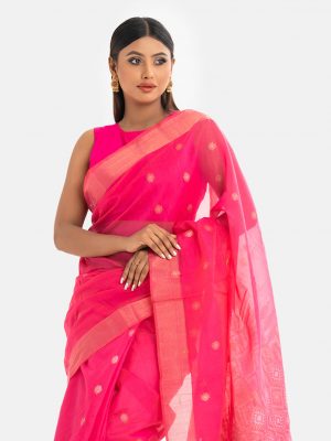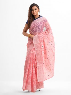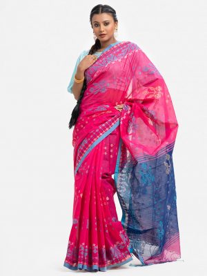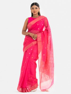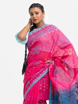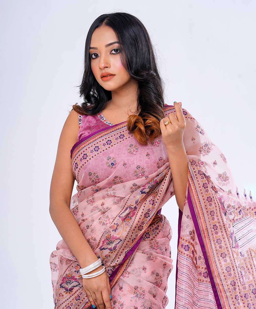 Pink all-over printed exclusive Saree in Muslin fabric with a purple border. Embellished with karchupi, and decorative tassels on the achal.