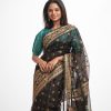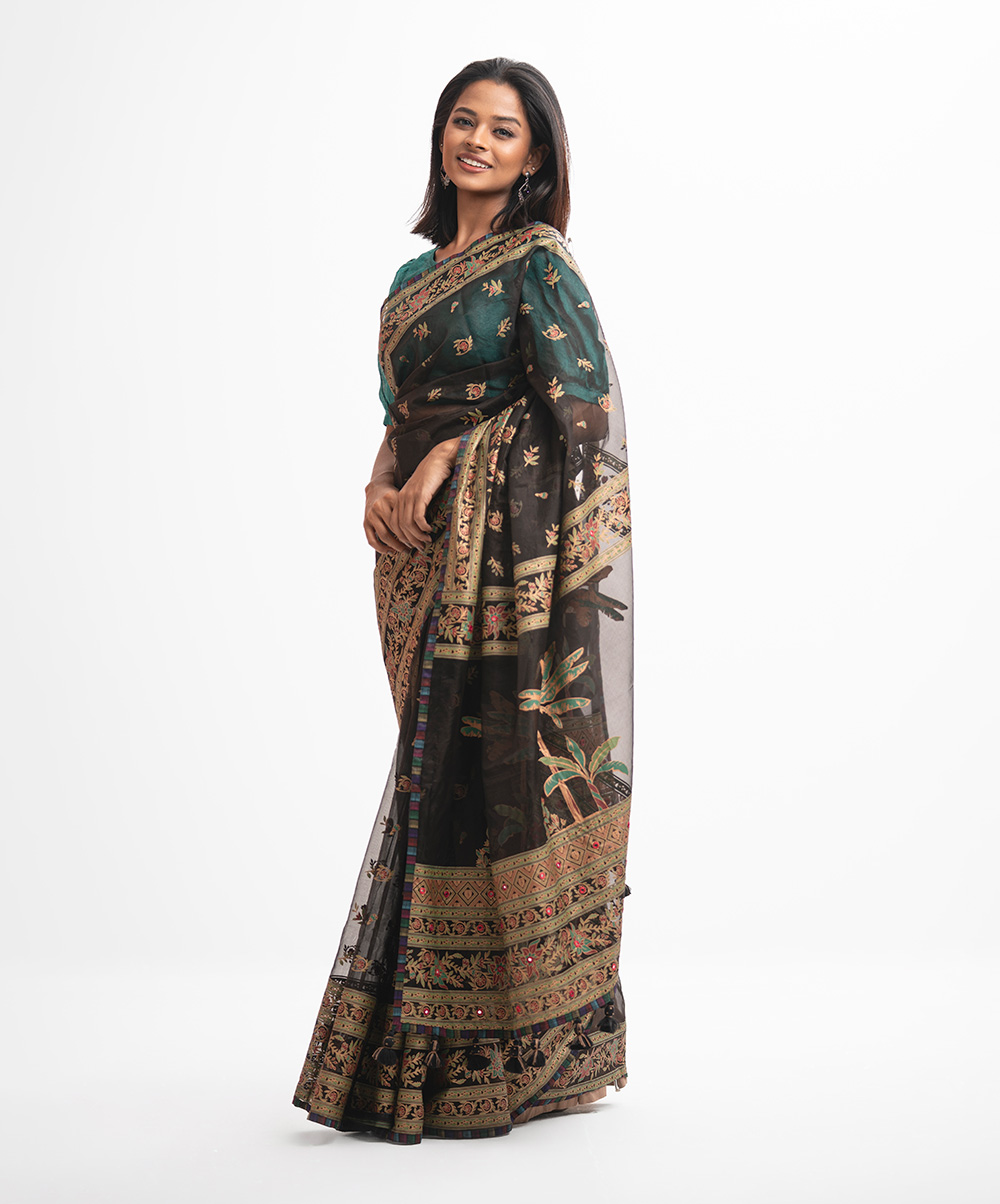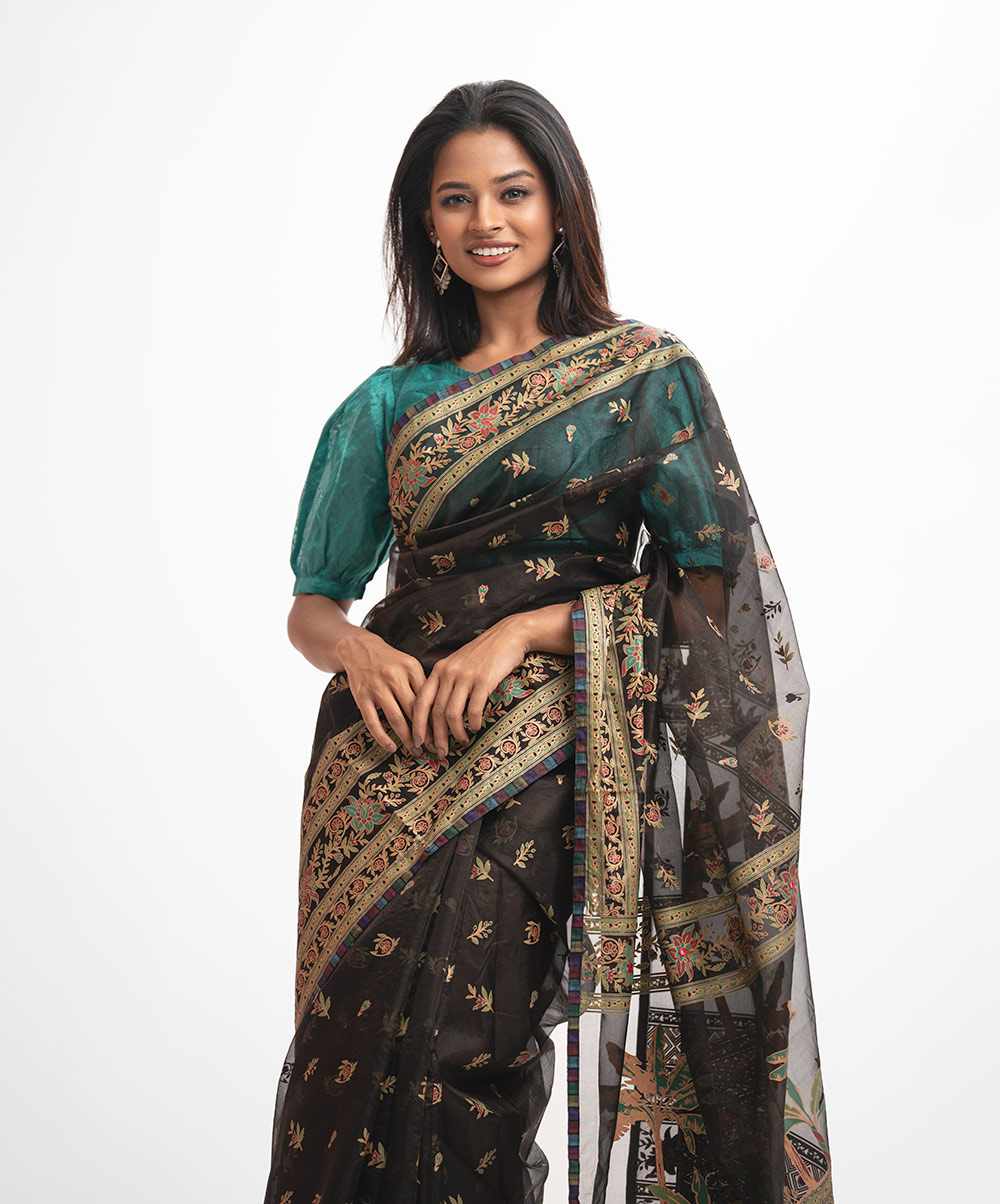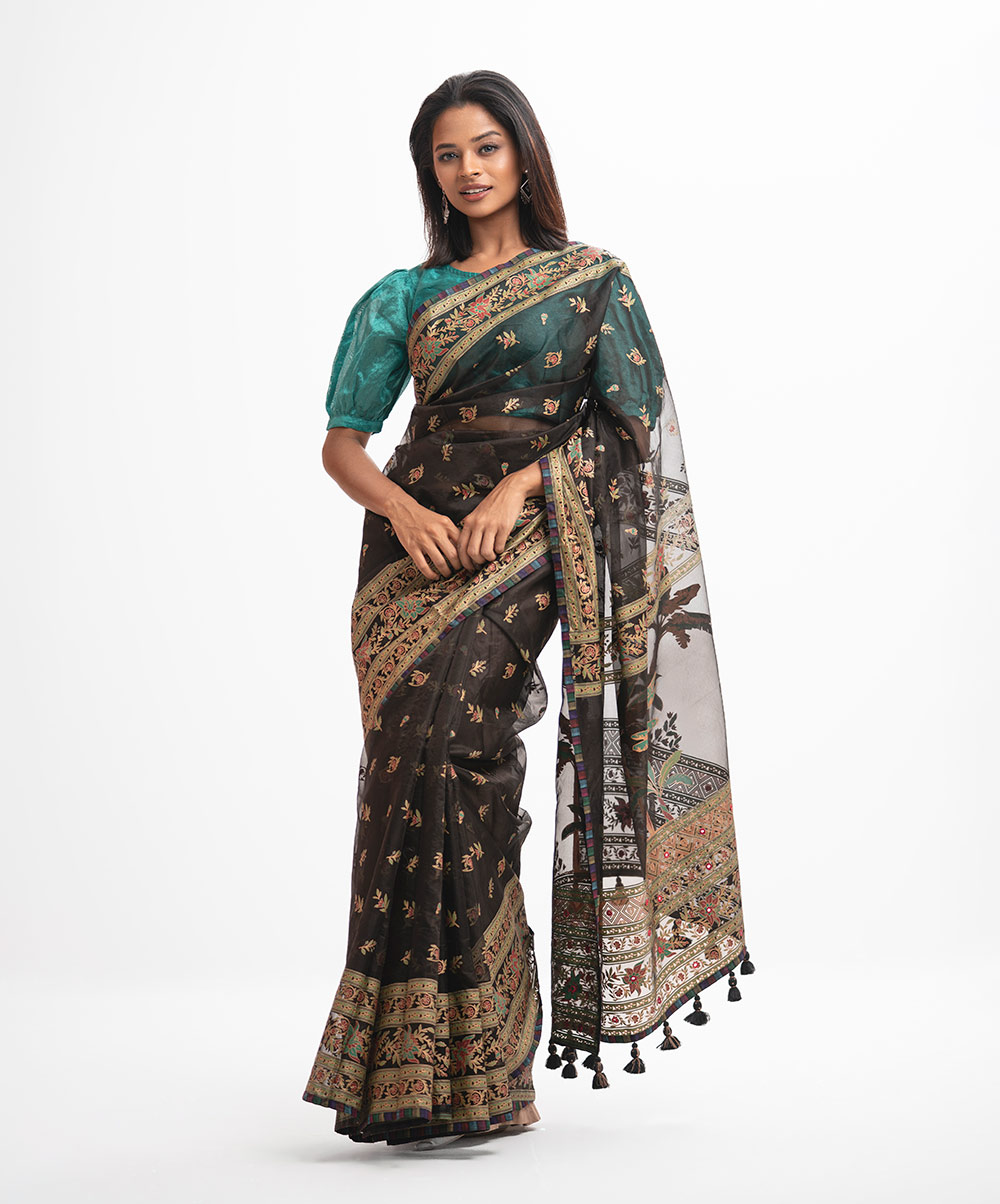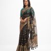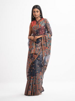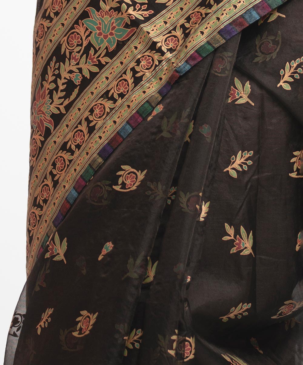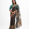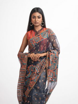 Women’s exclusive printed saree in muslin fabric. Patchwork, karchupi & tassels at the Aanchal.