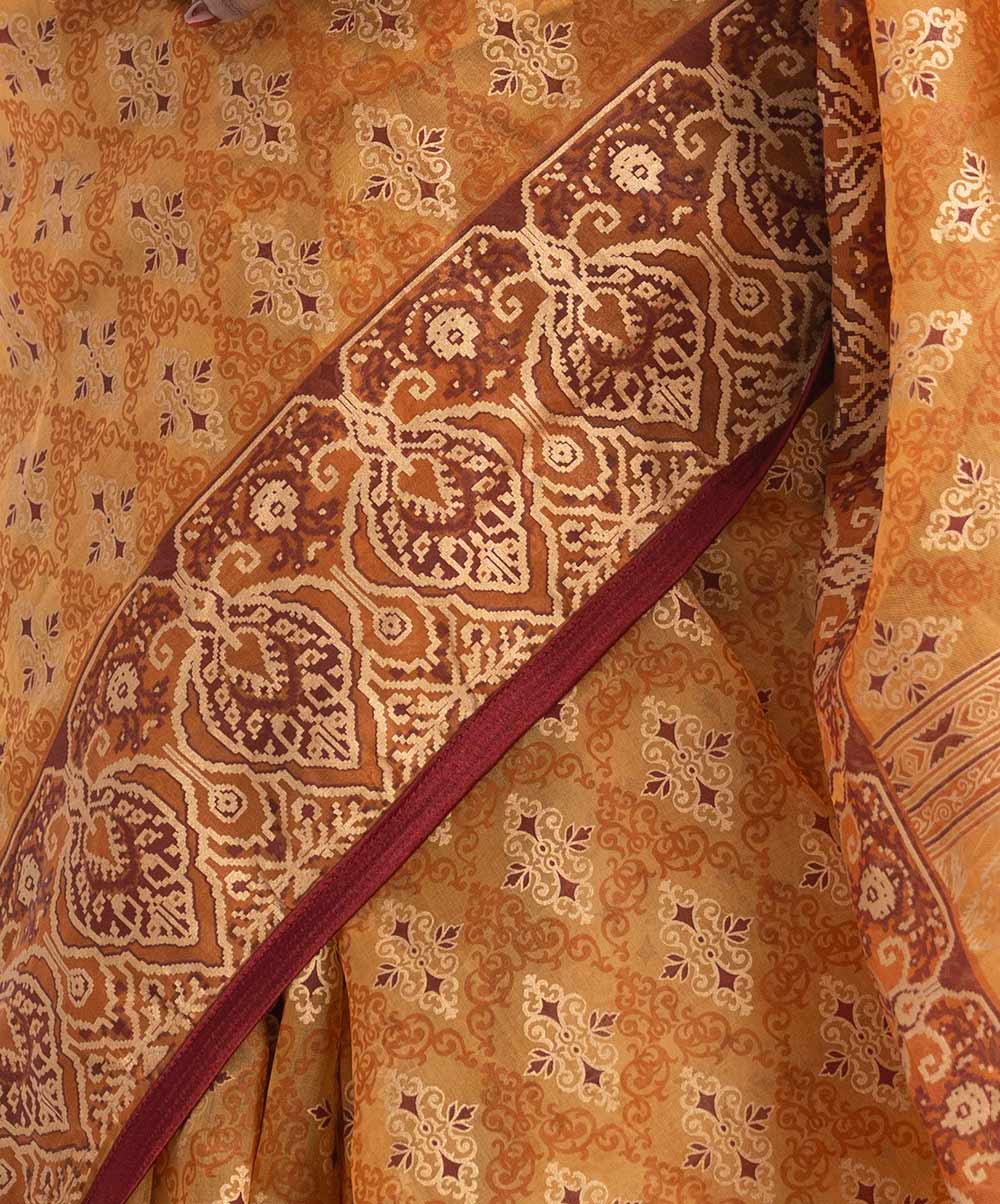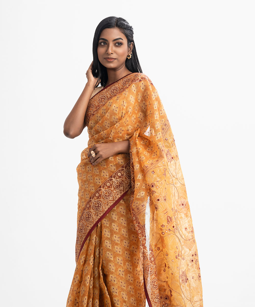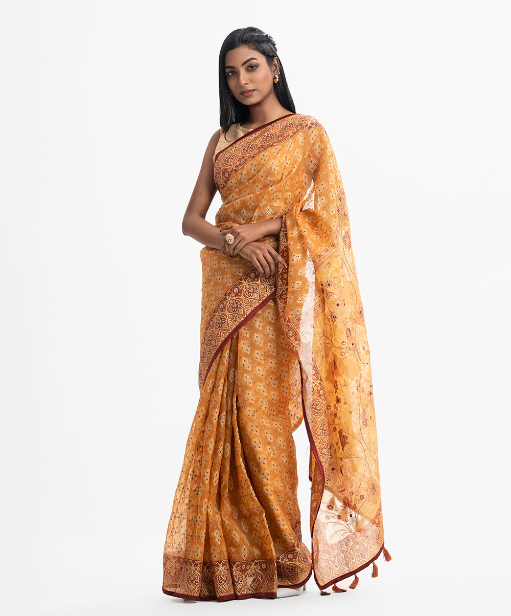 Women’s exclusive printed saree in muslin fabric. Heavy Karchupi at achal, patchwork at the border and added tassels.