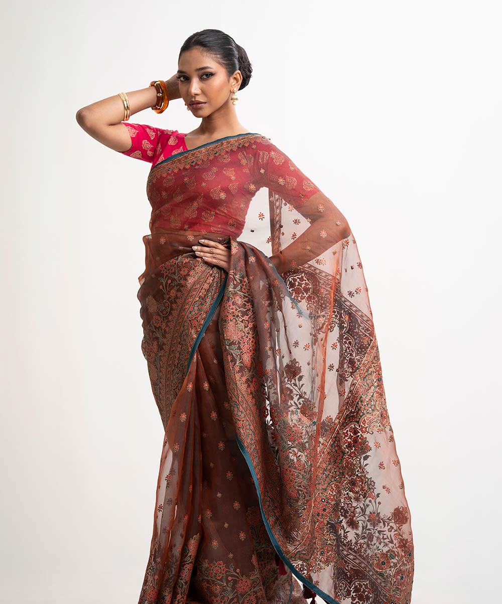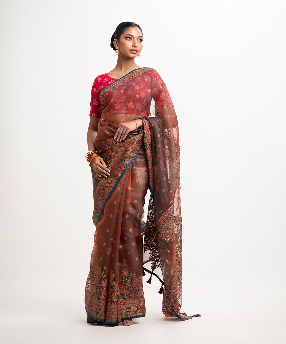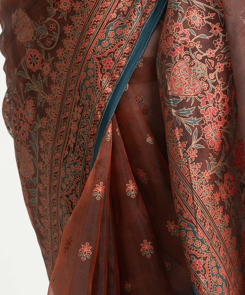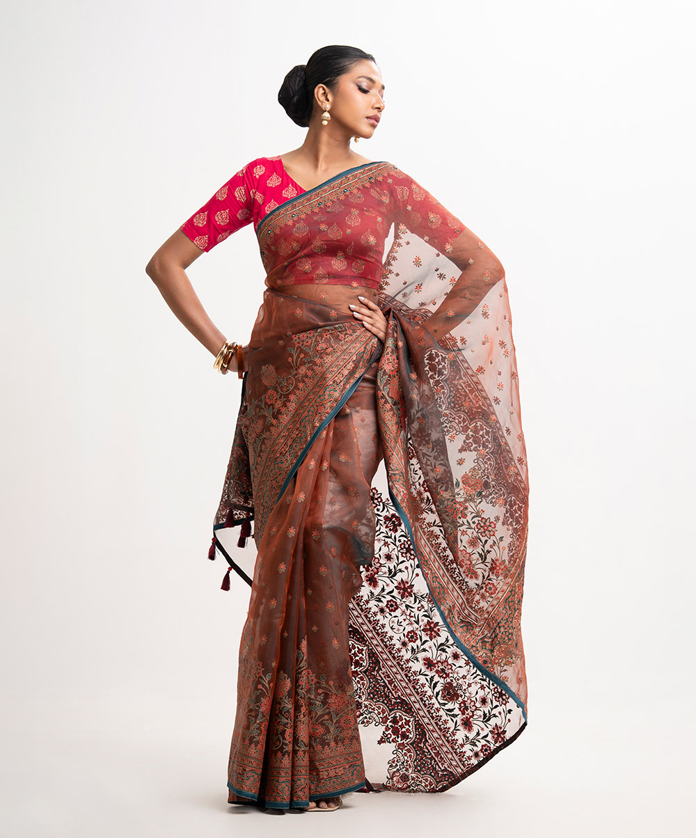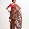 Women’s exclusive printed saree in muslin fabric. Heavy Karchupi at achal, patchwork at the border and added tassels.
