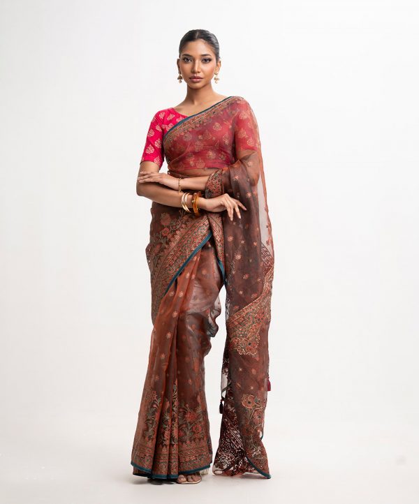 Women’s exclusive printed saree in muslin fabric. Heavy Karchupi at achal, patchwork at the border and added tassels.
