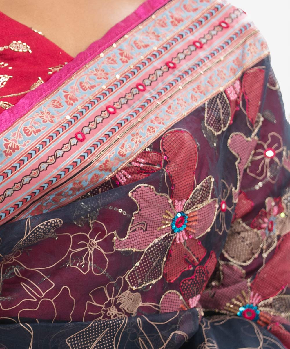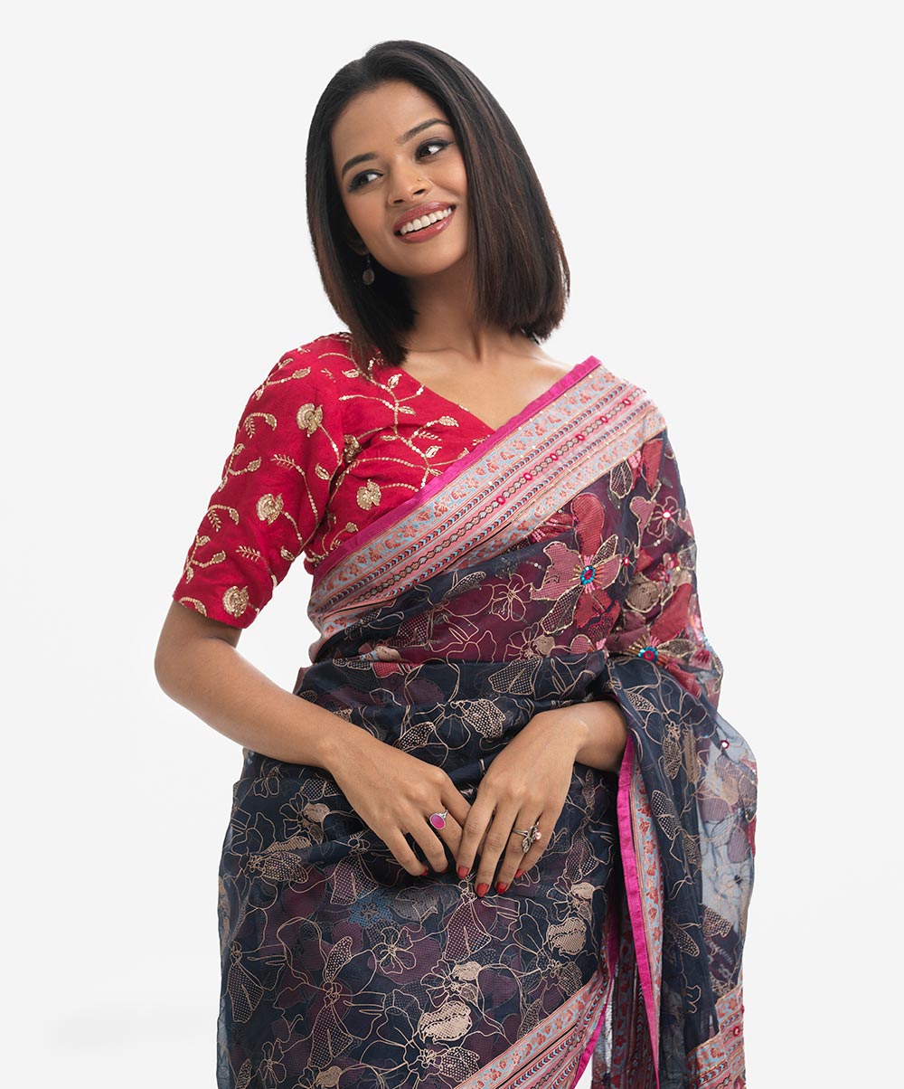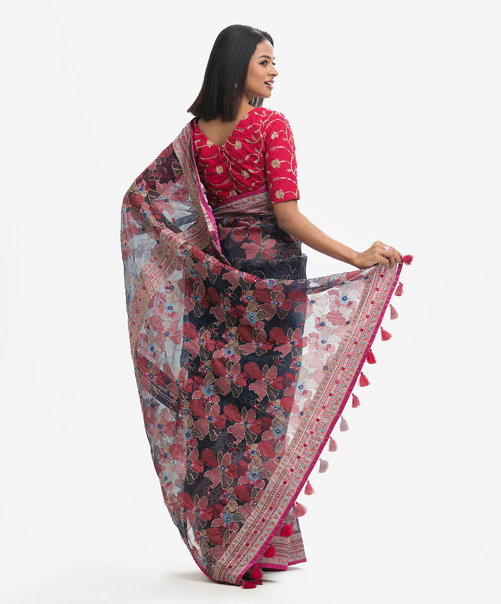Women’s exclusive floral printed saree in muslin fabric. Patchwork, karchupi & tassels at the Aanchal.