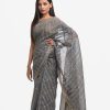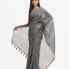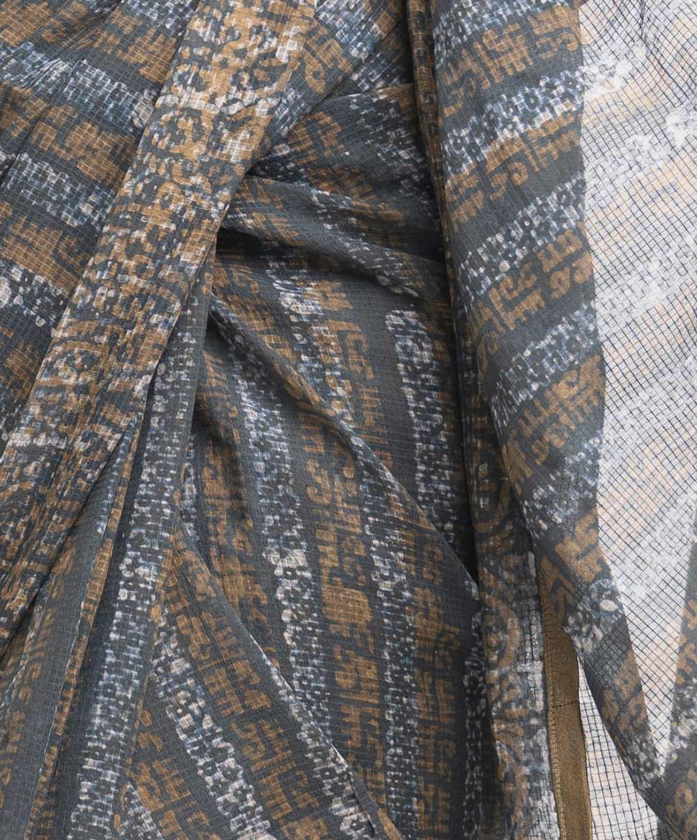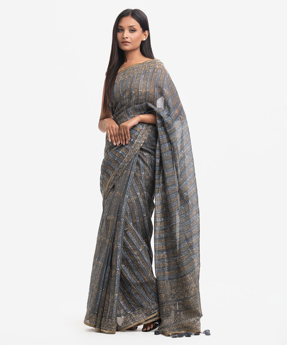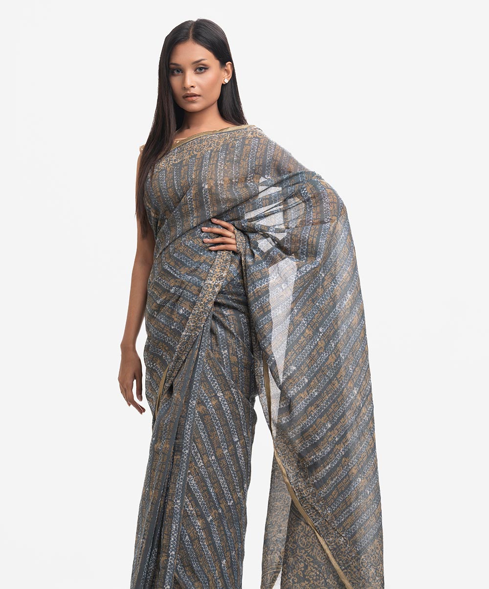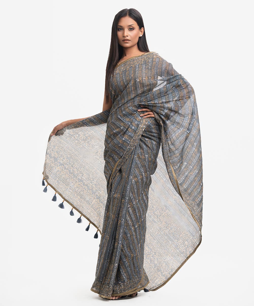 Women’s exclusive dye printed saree in cotton silk fabric. Golden patchwork at the border and added tassels.
