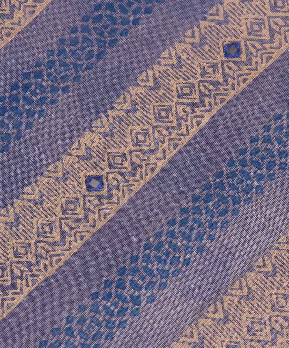 White cotton saree with allover print. Designed with contrast violet print and embroidery on anchal.