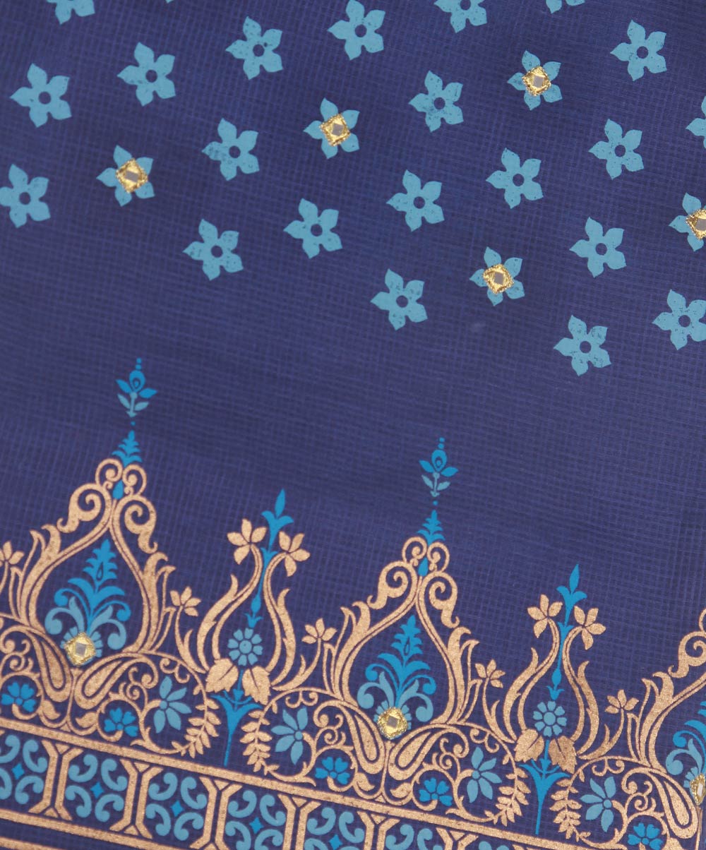 Blue cotton saree with allover print. Embellished with embroidery on anchal and contrast golden borders.
