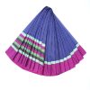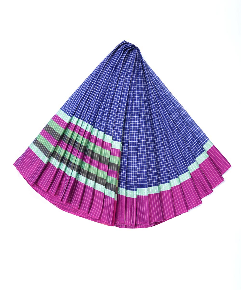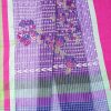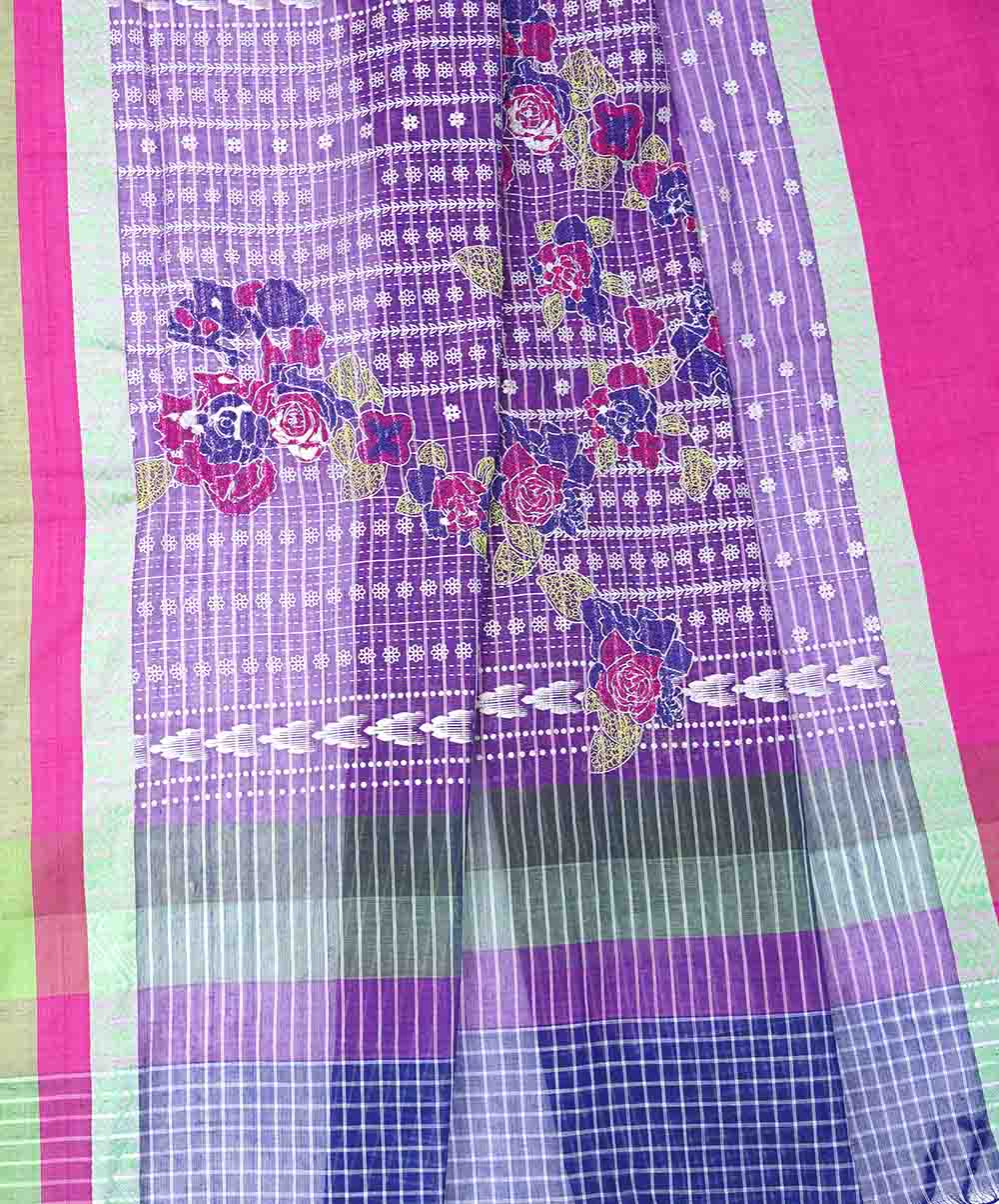 Purple and Blue check cotton saree with block print and screen print. Aanchal with multi-colored embroidery.