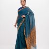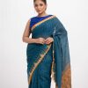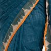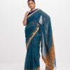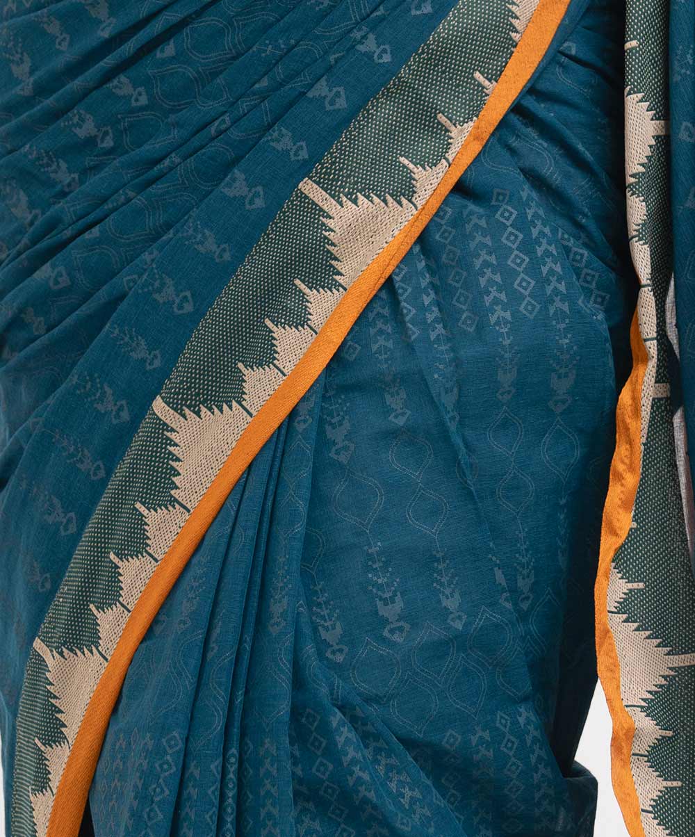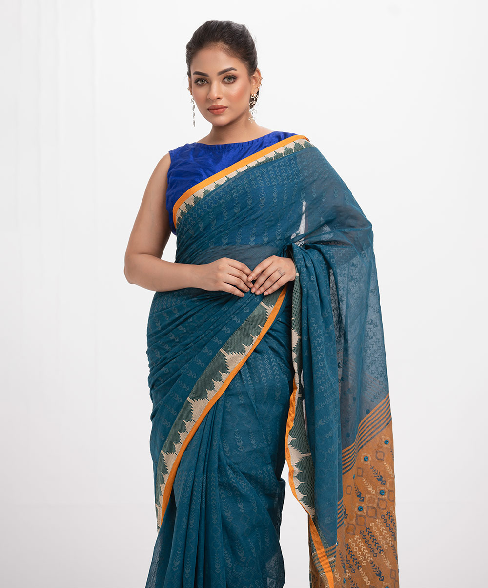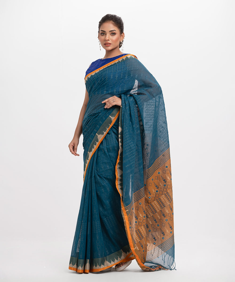 Women’s printed Saree in cotton fabric. Embellished with karchupi and fringe trim at the border of Aanchal.