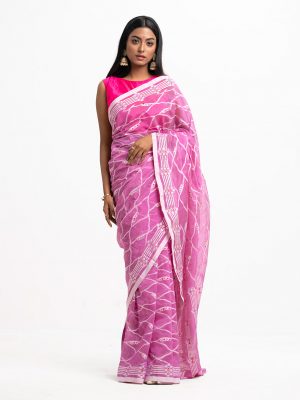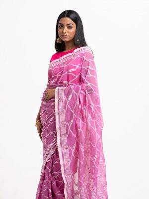 Women’s traditional saree in cotton fabric. Embellished with weaving details and fringe trim at the achal.