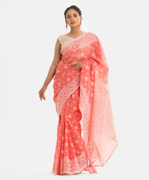 Women’s half silk saree with weaving details.
