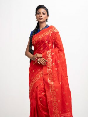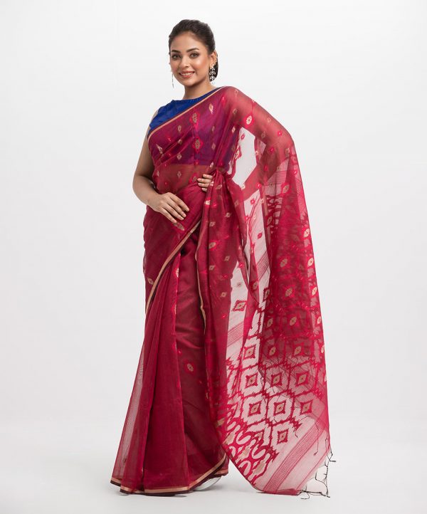 All-over weaving details saree in half-silk fabric. Fringe trim at the border of Aanchal.