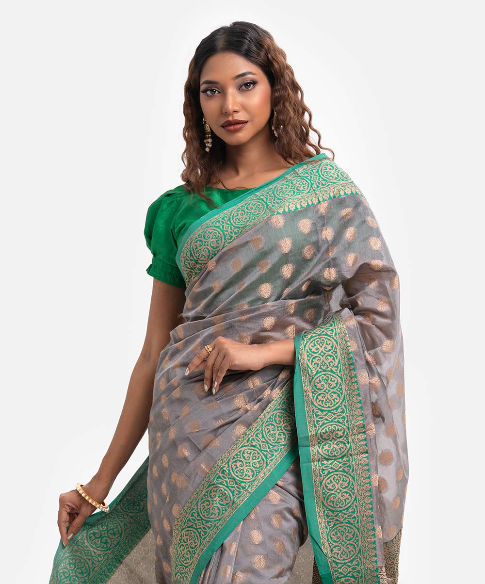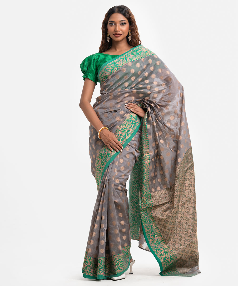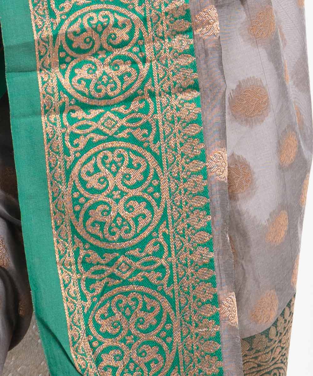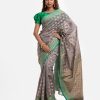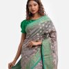 Women’s printed art silk katan saree with weaving details.