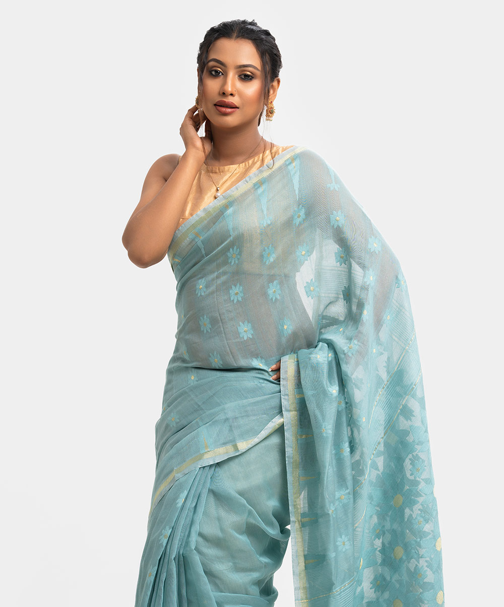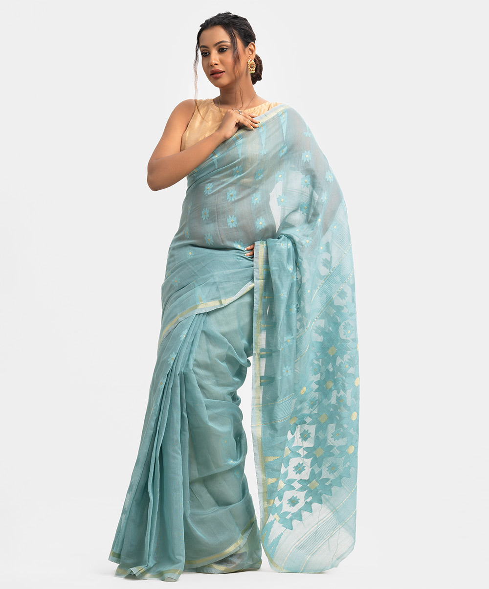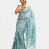 Women’s printed art silk katan saree with weaving details.