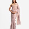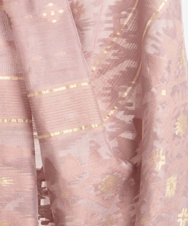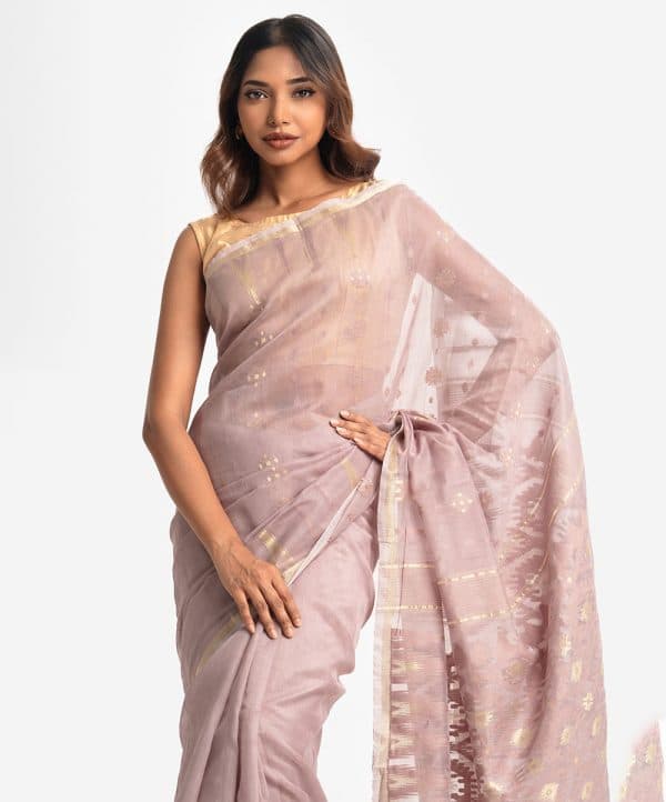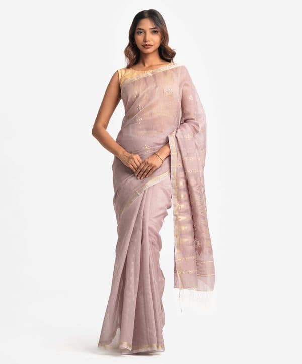 All-over weaving details saree in half-silk fabric. Fringe trim at the border of Aanchal.