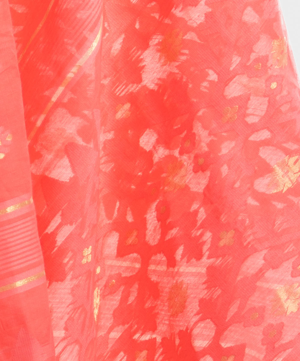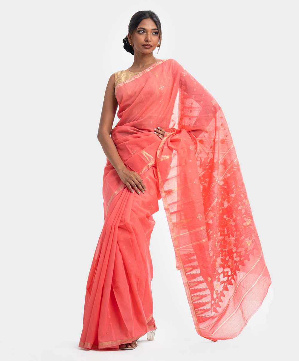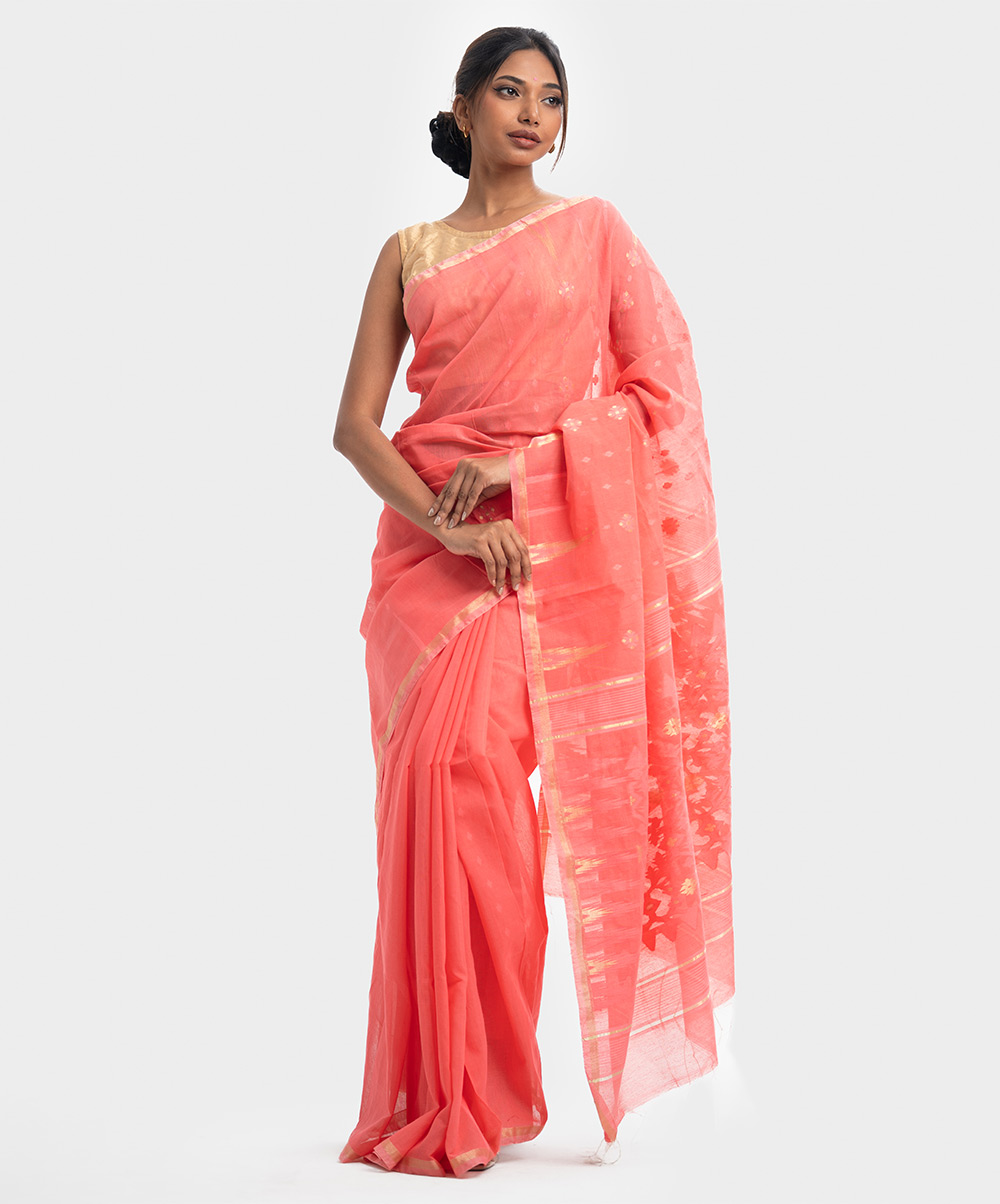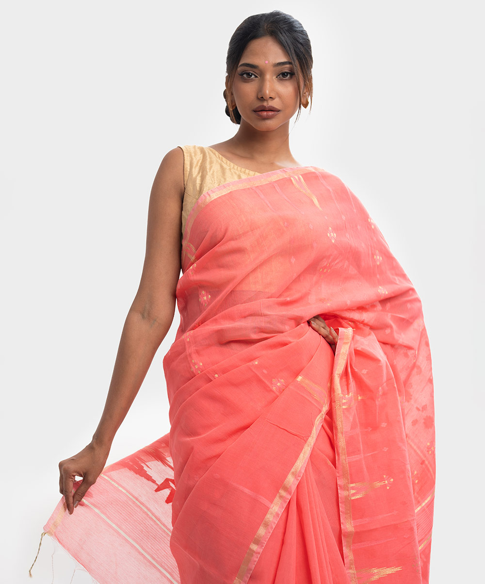 All-over weaving details saree in half-silk fabric. Fringe trim at the border of Aanchal.