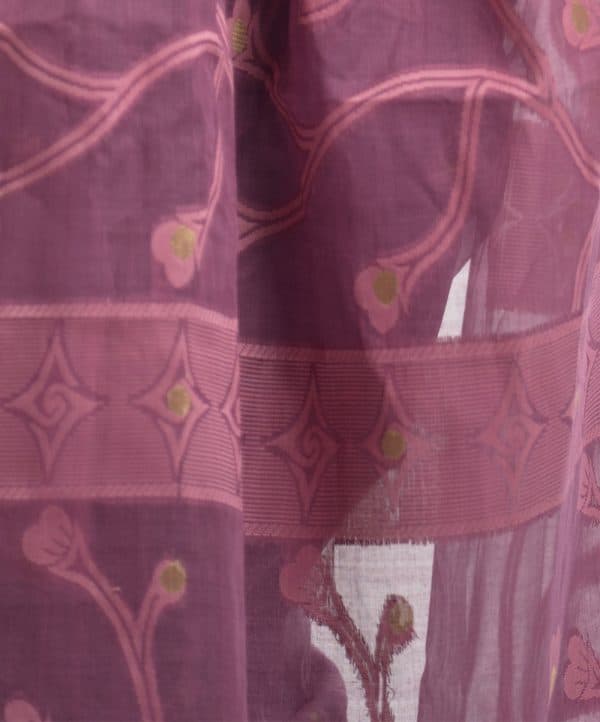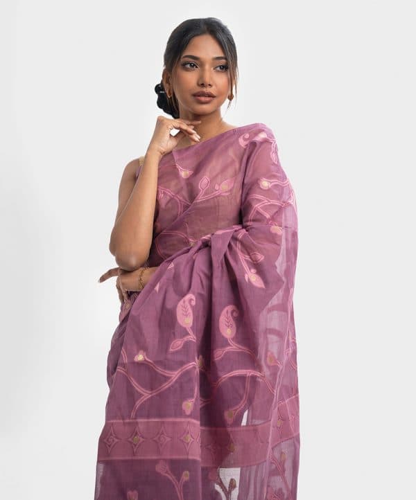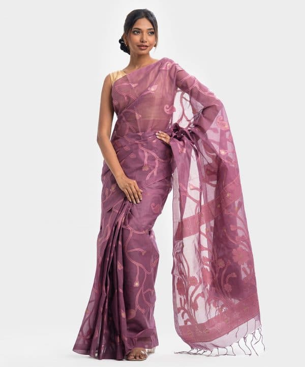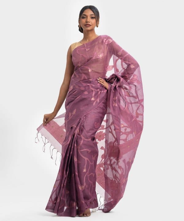 All-over weaving details saree in cotton fabric. Fringe trim at the border of Aanchal.