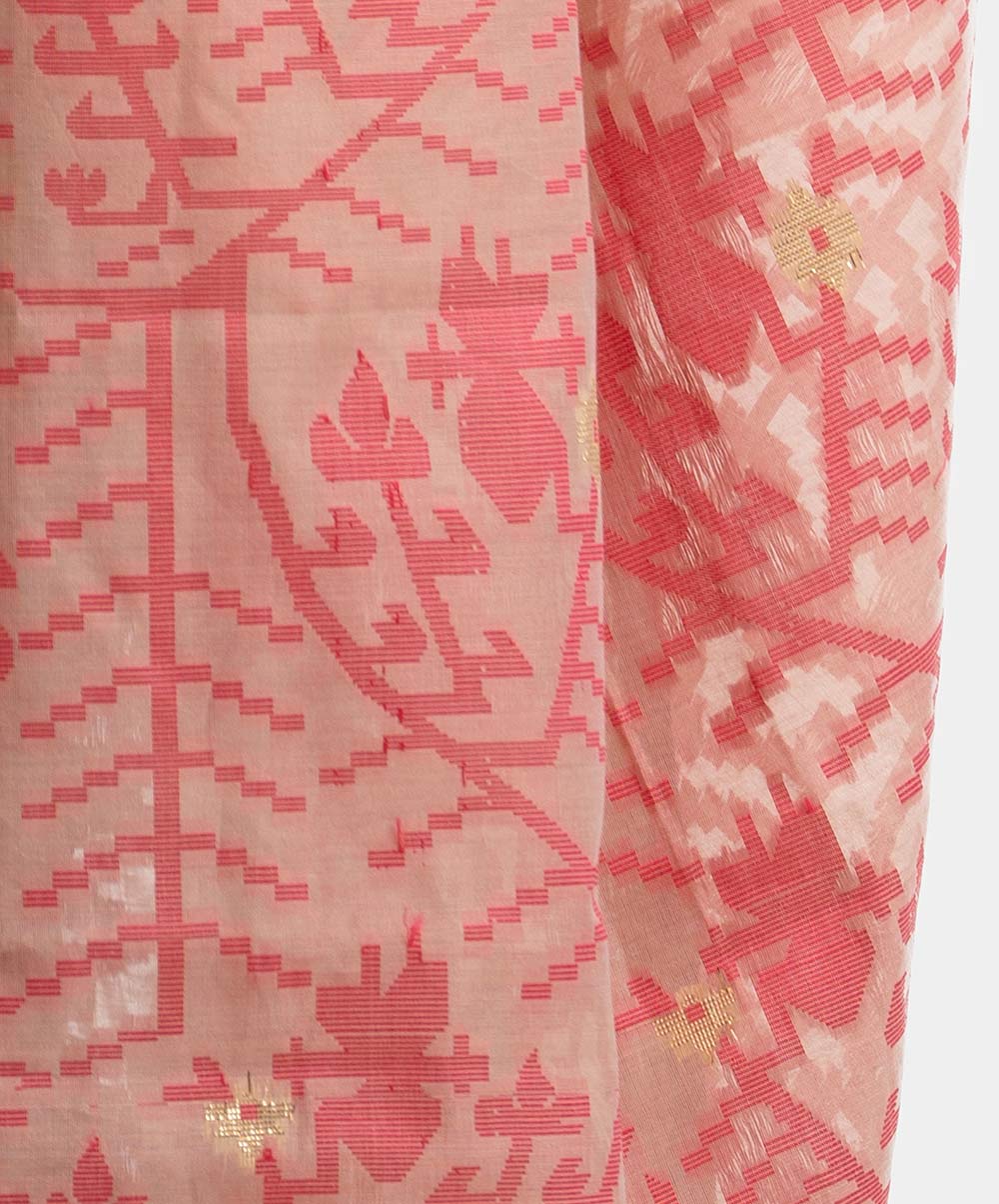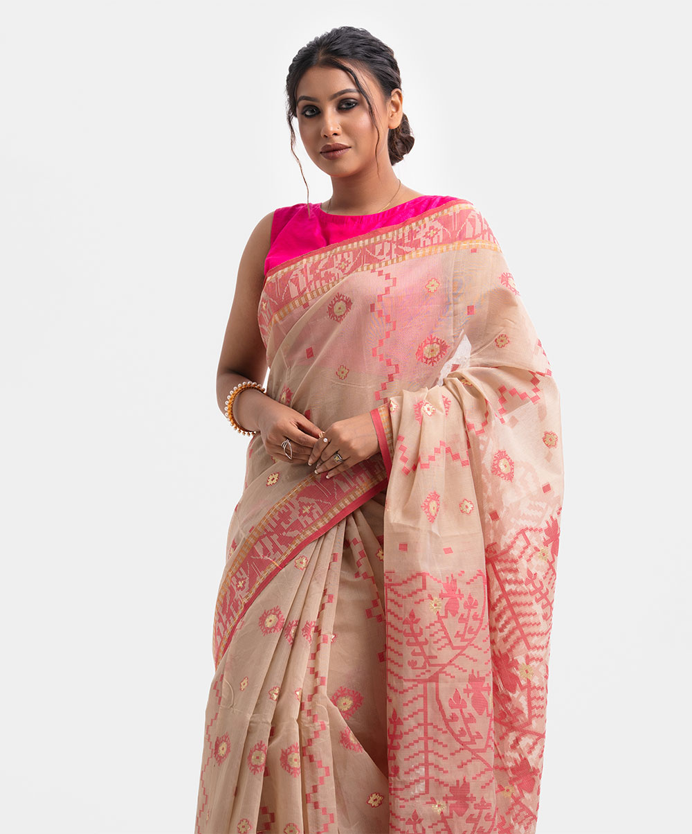Women’s jamdani-themed art silk saree with weaving details.