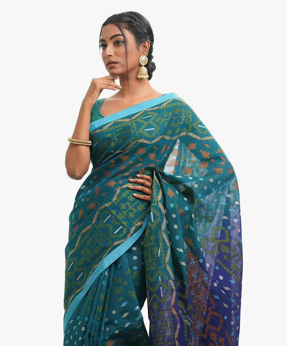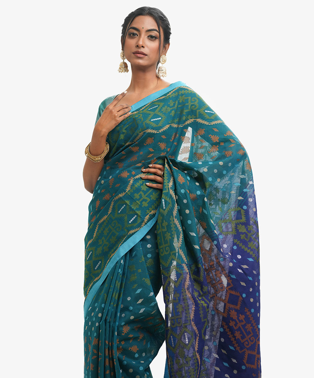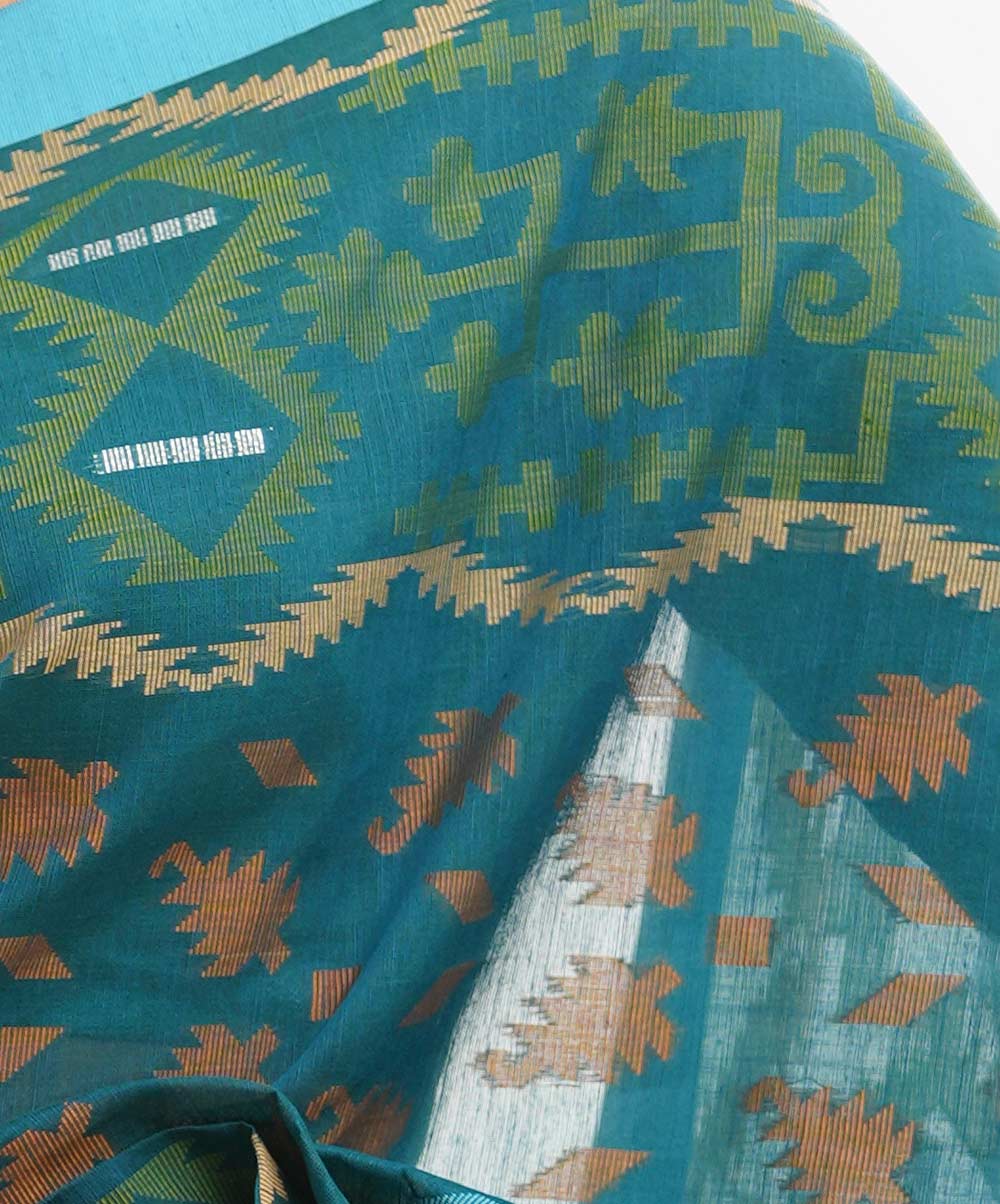 All-over weaving details saree in half-silk fabric. Frill trim at the Aanchal.