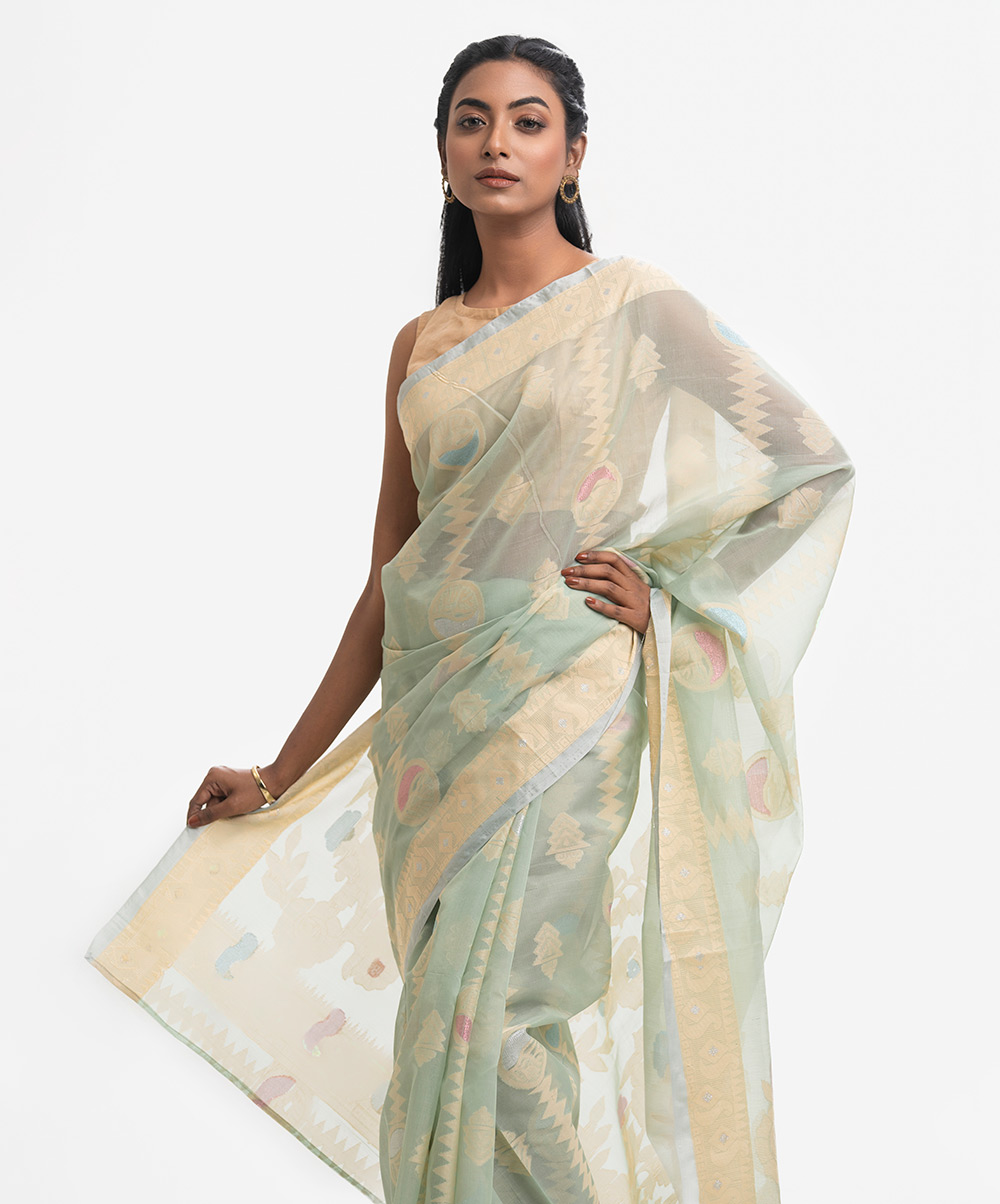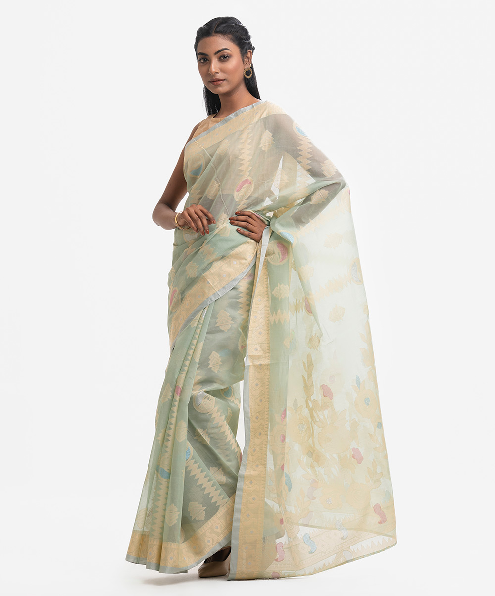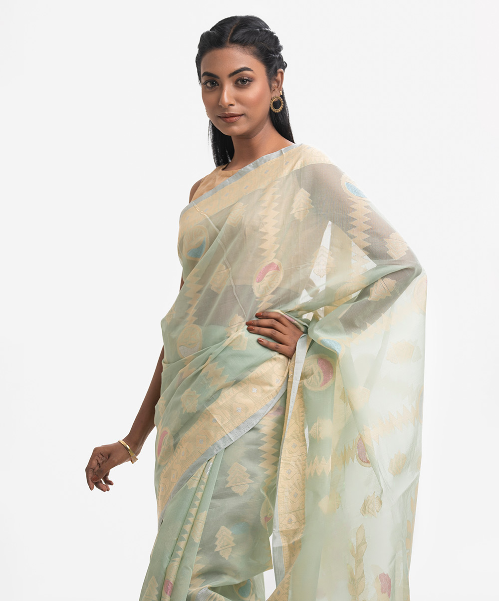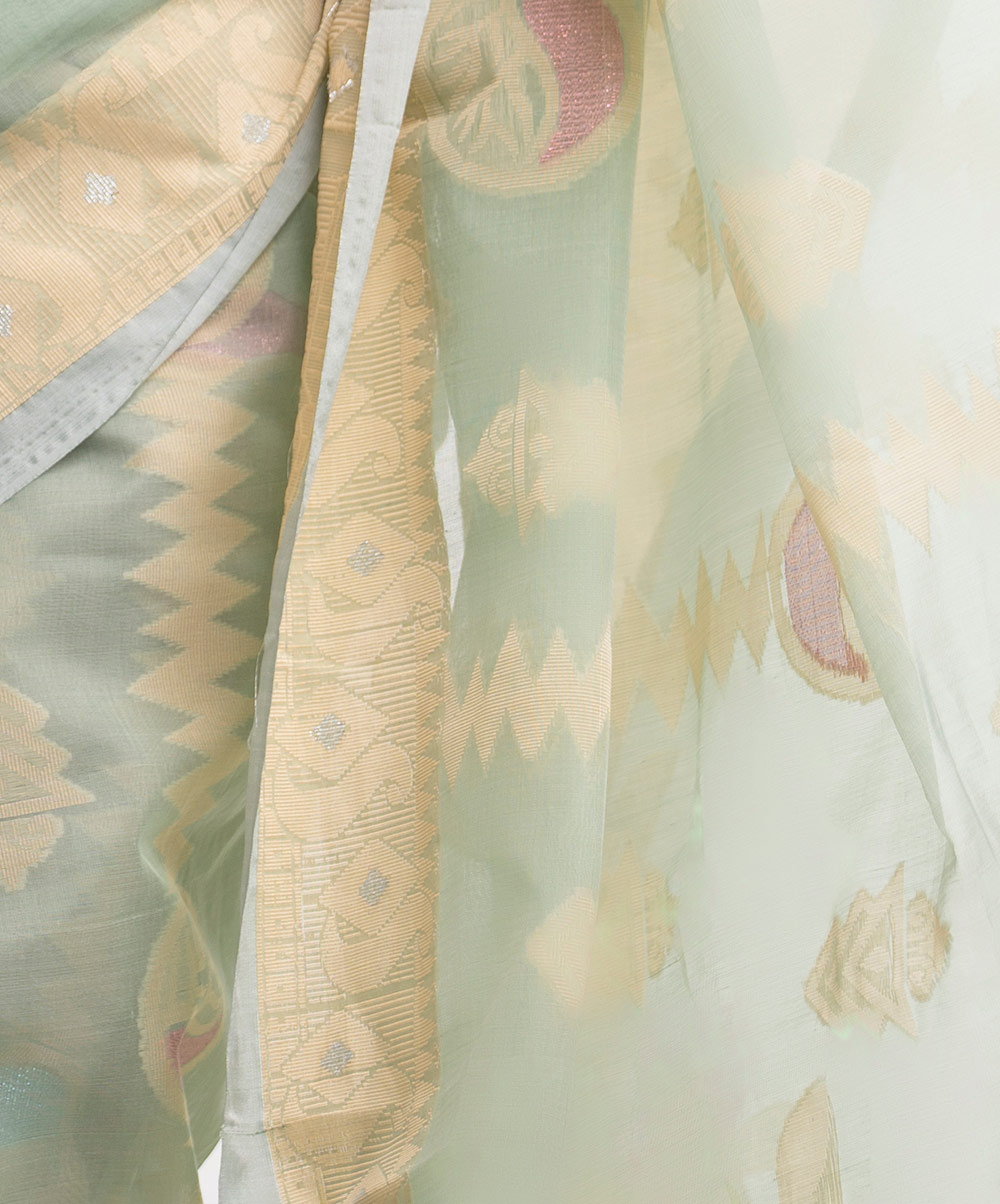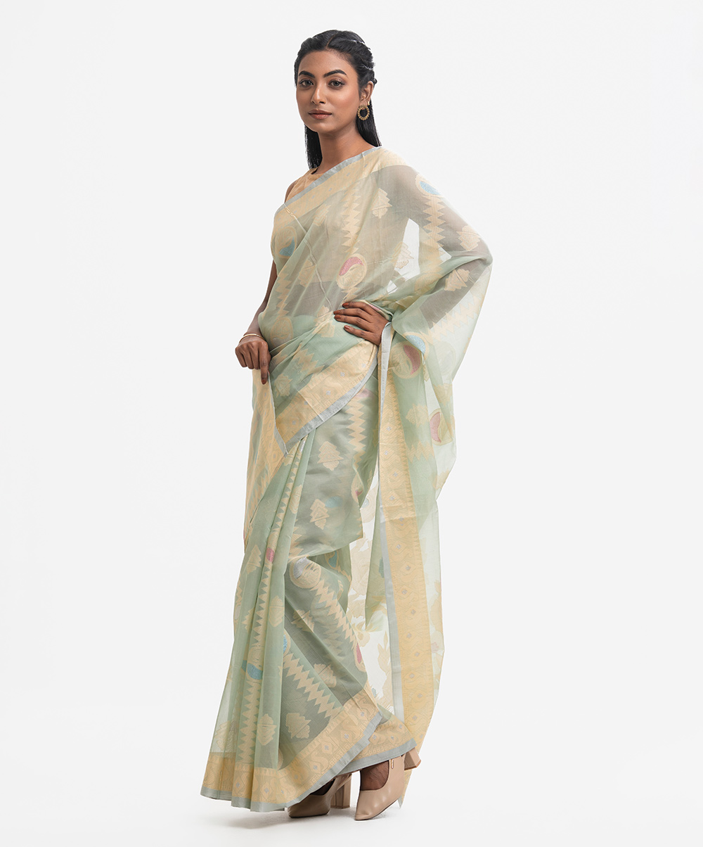 All-over weaving details saree in half-silk fabric. Zari details at the Aanchal.