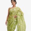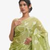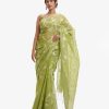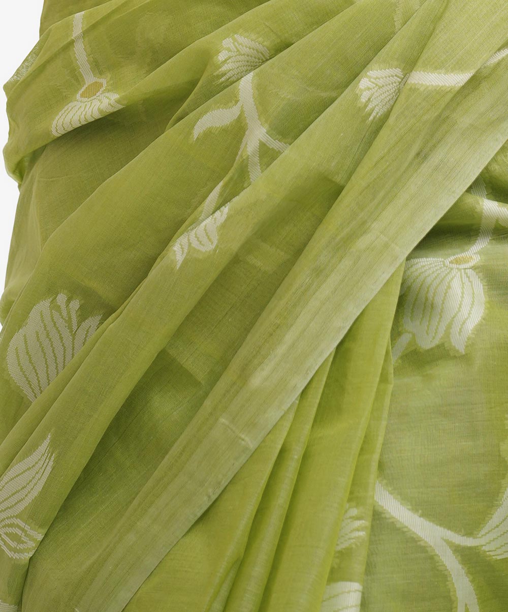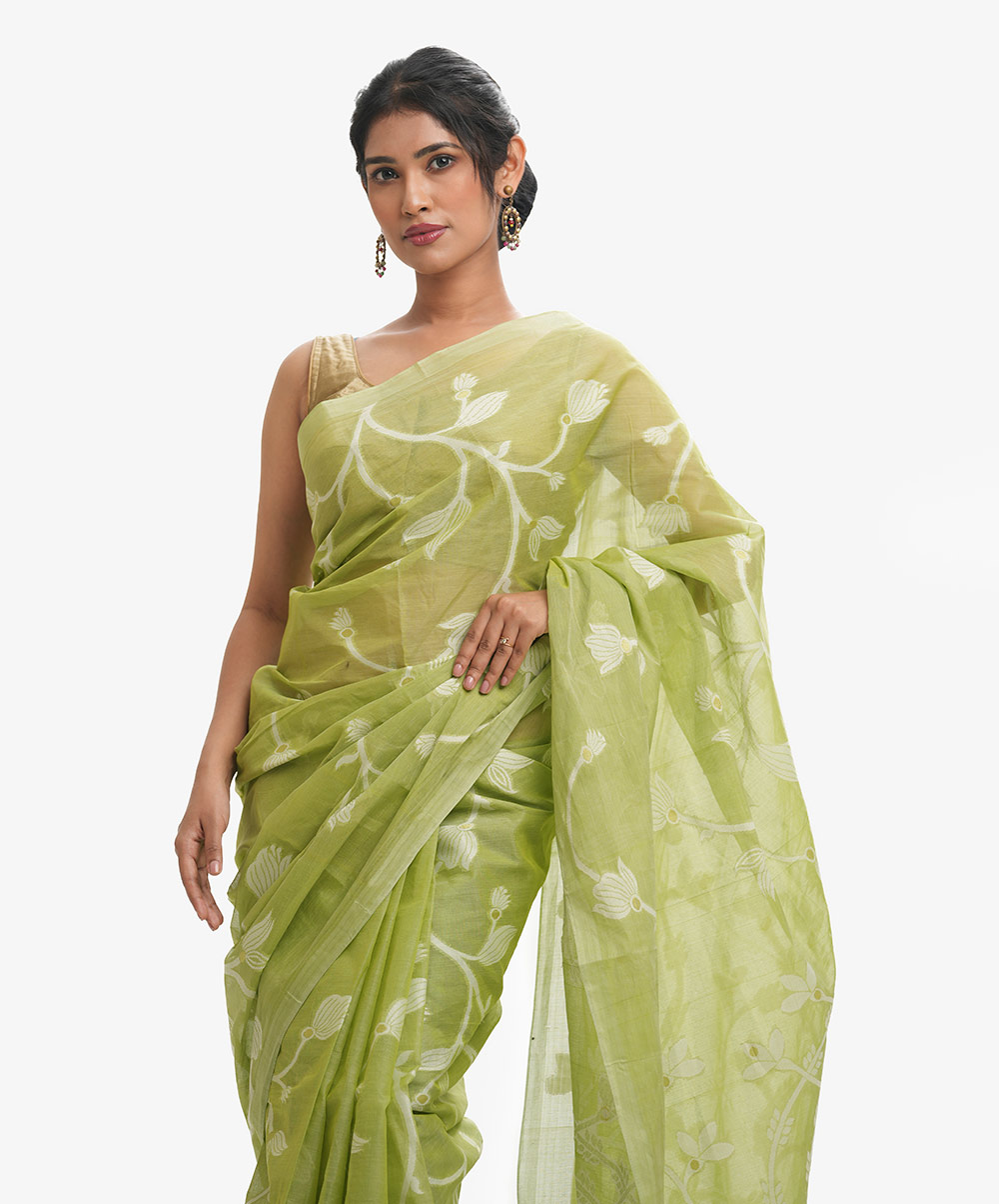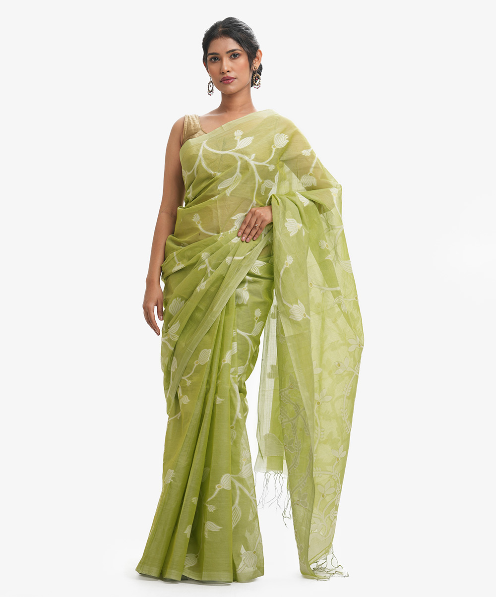 All-over weaving details saree in cotton fabric. Golden thread detail & frill trim at the Aanchal.
