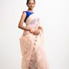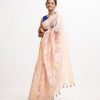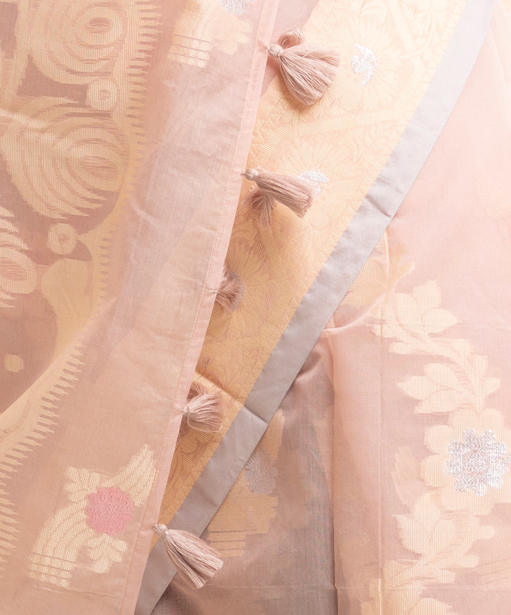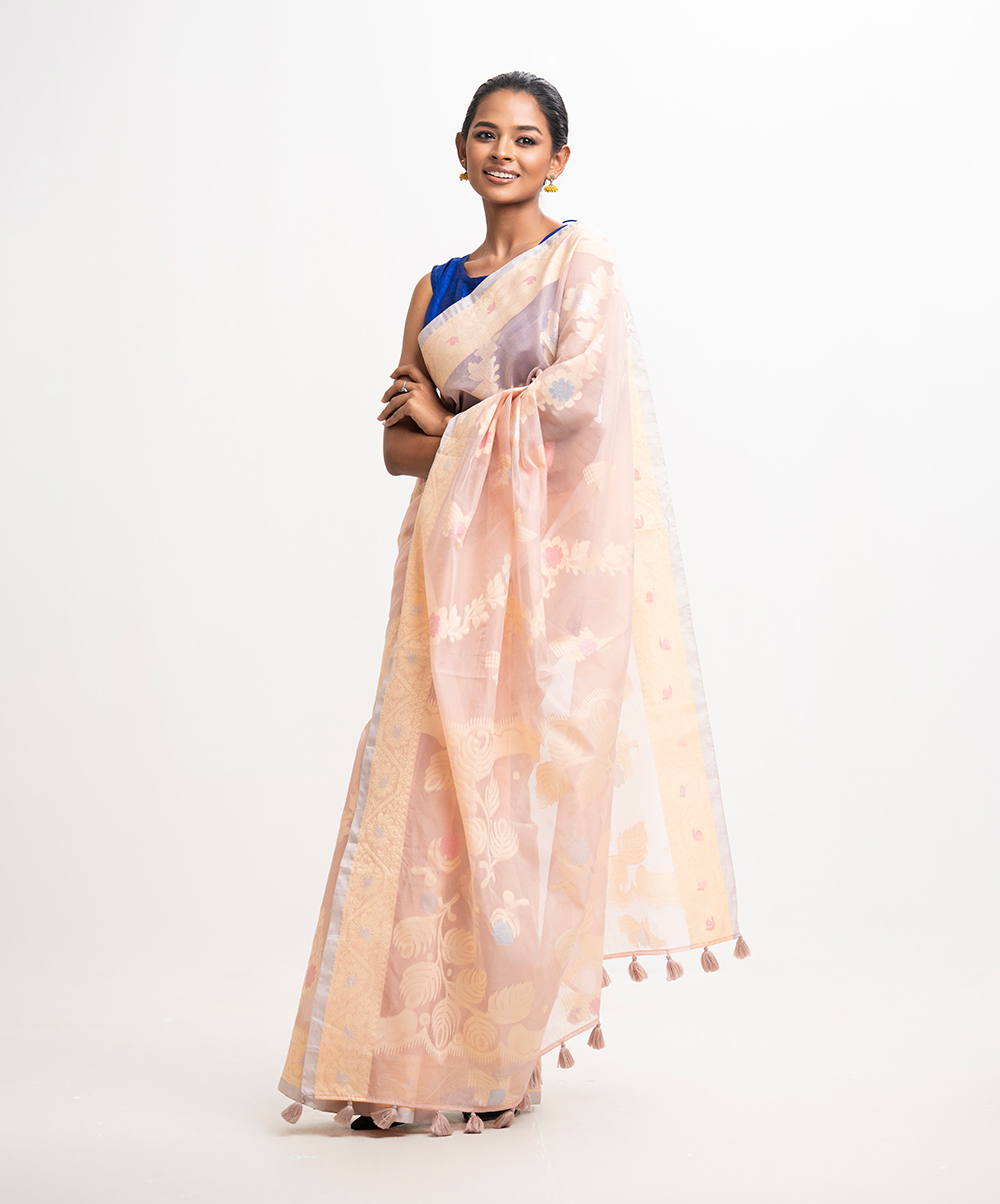 All-over jamdani pattern weaving details saree in half-silk fabric. Tassels at the Aanchal.